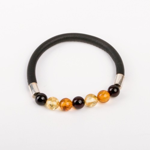 Bransoletka skórzana z kulkami bursztynu w kolorach koniakowym, wiśniowym i cytrynowym. Prosta i efektowna, sprawdzi się na wielkie wyjścia jak też do pracy.