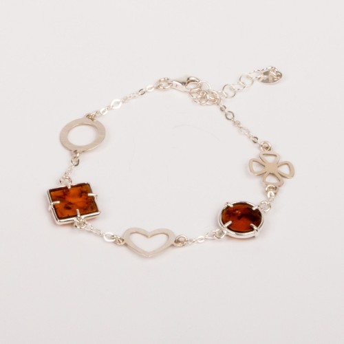 Bransoletka wykonana ze srebra i bursztynu. Elementy bursztynowe zakute w delikatnej oprawie i srebrne kształty wycięte z cienkich blaszek połączone są ze sobą prostym łańcuszkiem. Taka bransoletka z bursztynem jest bardzo uniwersalna i można ją dowolnie nosić do codziennych stylizacji do pracy czy na wyjścia ze znajomymi.