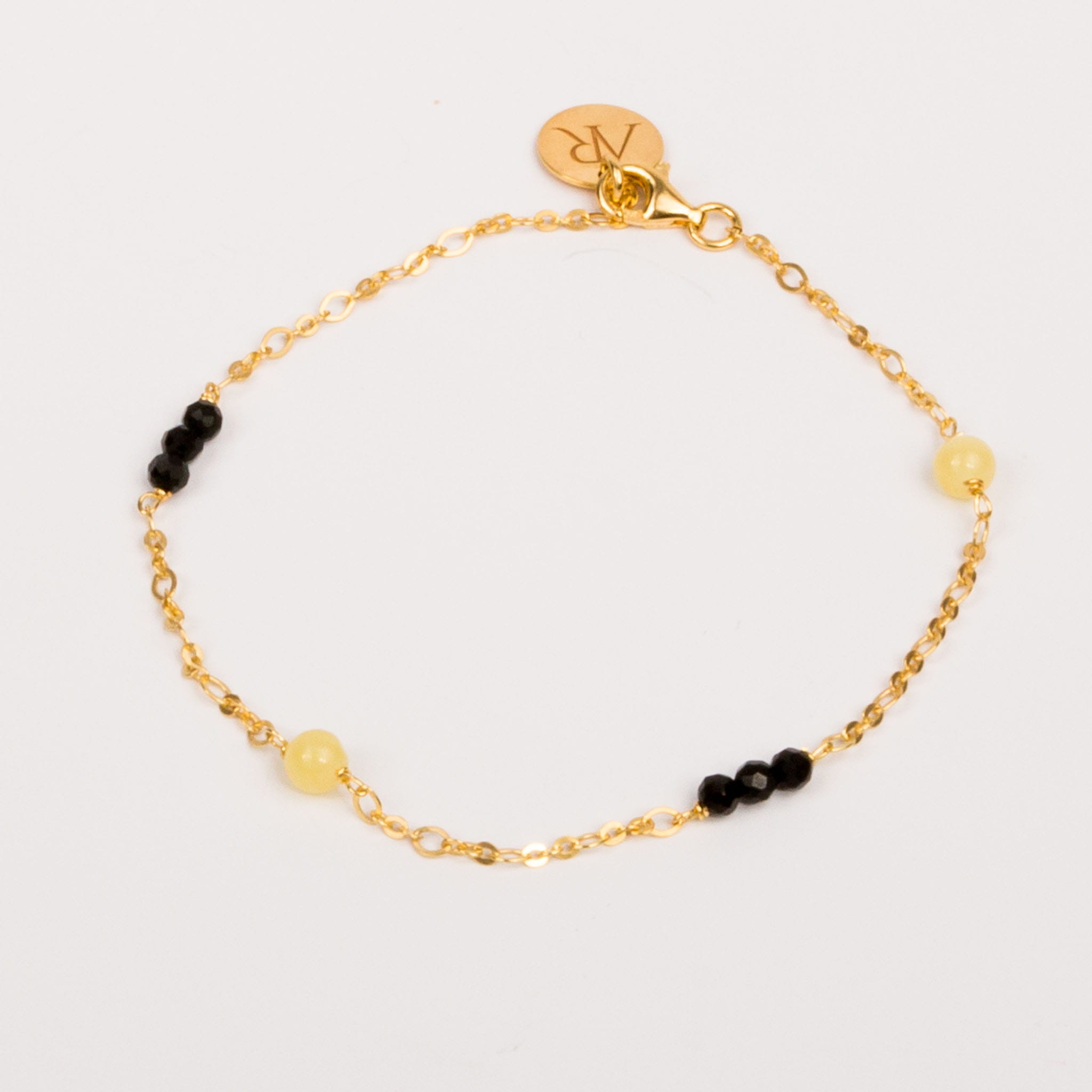 Srebrna pokryta złotem bardzo subtelna bransoletka z koralikami z kamieni naturalnych bursztynu i onyksu. Taka bransoletka z bursztynem jest bardzo uniwersalna i można ją dowolnie nosić do codziennych stylizacji do pracy czy na wyjścia ze znajomymi.