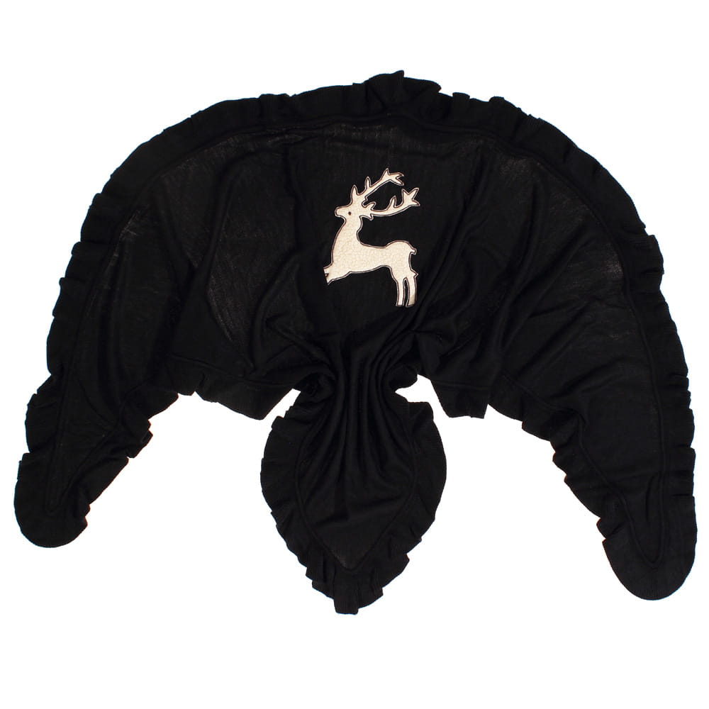 Piękna chusta z aplikacją jelonka zapewni ciepło w chłodne dni, świetnie nadaje się do kurtki oraz jako okrycie na ramiona. Idealnie zestawisz ją z każdą stylizacją, na elegancko i na sportowo.Wykończona uroczą falbanką..