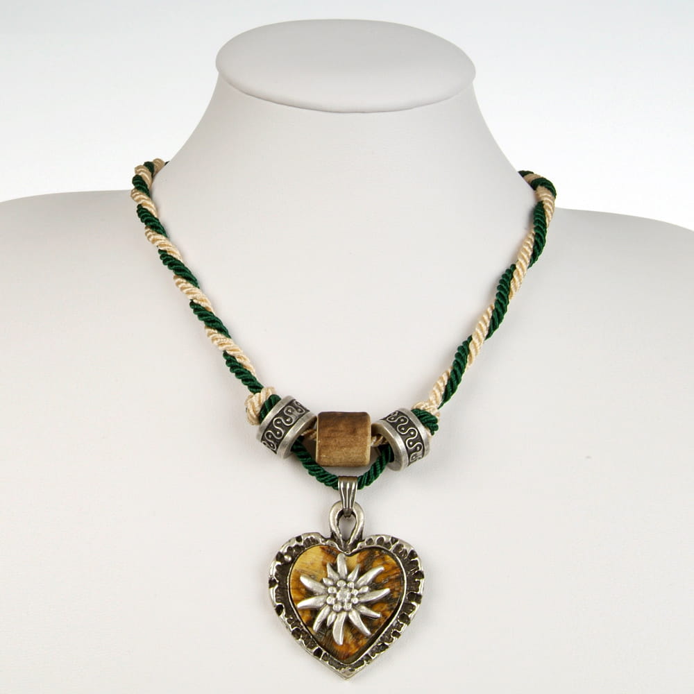 Naszyjnik serce z szarotką na sznurku beżowo-ciemnozielonym