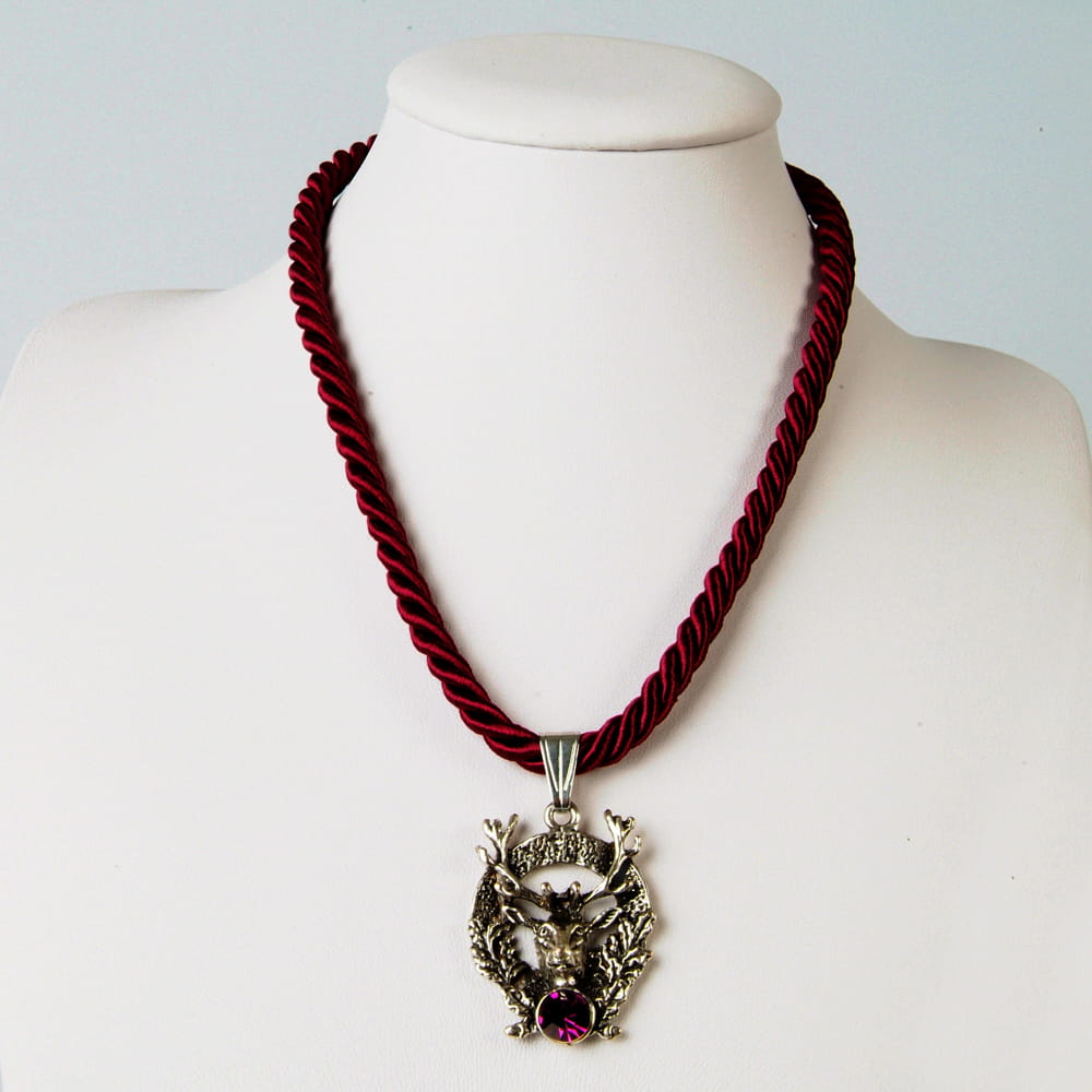 Zawieszka z jeleniem na satynowym,ciemnofioletowym sznurku.