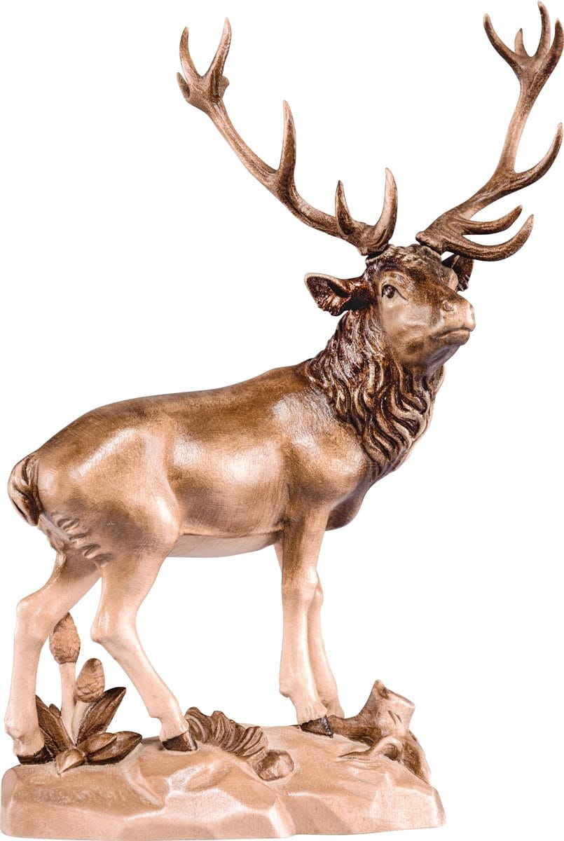 Figura drewniana JELEŃ wyrzeźbiona we Włoszech (Val Gardena) przez miejscowych artystów. Region słynie z ręcznie wytwarzanych figur, płaskorzeźb, szopek Bożonarodzeniowych i wielu innych przedmiotów artystycznych wykonanych z drewna. Od XIX wieku, produkowane są tam rzeźby i ołtarze rzeźbione dla kościołów katolickich na całym świecie.