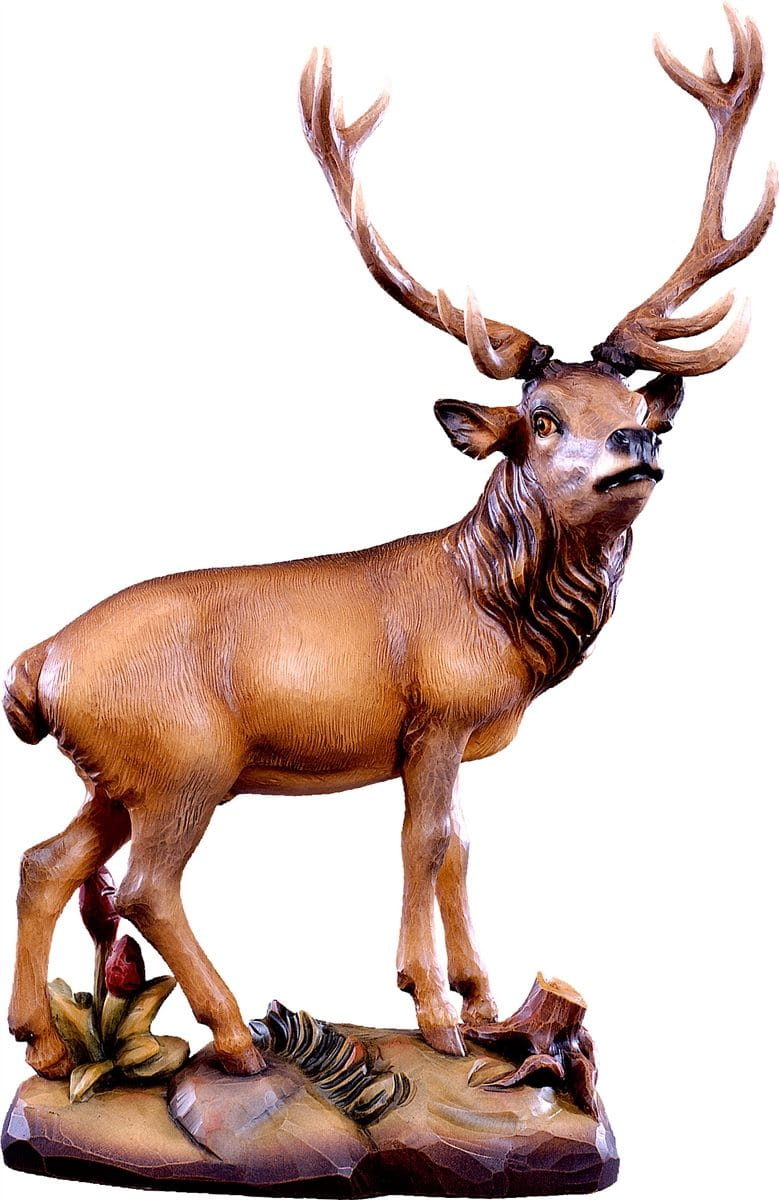 Figura drewniana JELEŃ wyrzeźbiona we Włoszech (Val Gardena) przez miejscowych artystów. Region słynie z ręcznie wytwarzanych figur, płaskorzeźb, szopek Bożonarodzeniowych i wielu innych przedmiotów artystycznych wykonanych z drewna. Od XIX wieku, produkowane są tam rzeźby i ołtarze rzeźbione dla kościołów katolickich na całym świecie.
