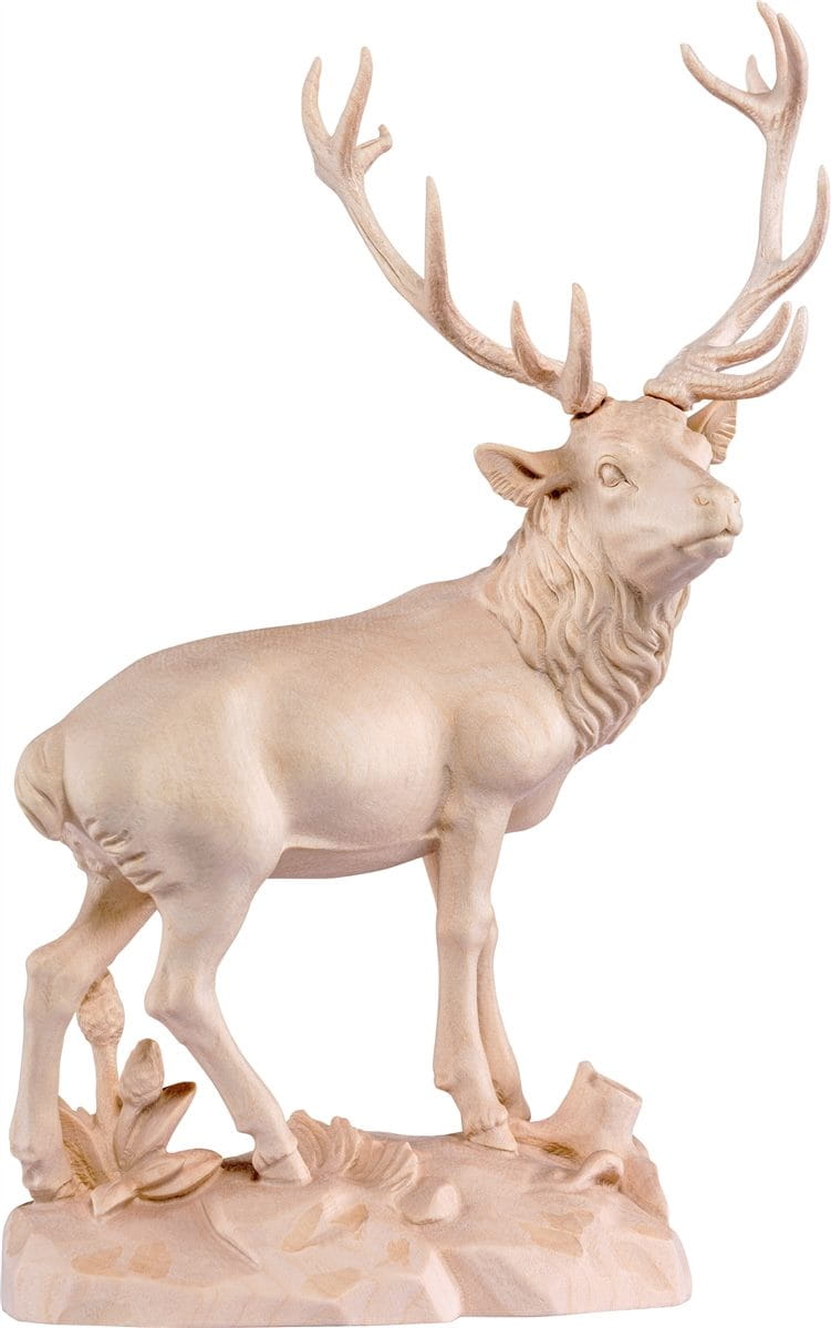 Figura drewniana JELEŃ wyrzeźbiona we Włoszech (Val Gardena) przez miejscowych artystów. Region słynie z ręcznie wytwarzanych figur, płaskorzeźb, szopek Bożonarodzeniowych i wielu innych przedmiotów artystycznych wykonanych z drewna. Od XIX wieku, produkowane są tam rzeźby i ołtarze rzeźbione dla kościołów katolickich na całym świecie.