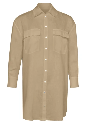 Bluzka koszulowa firmy Fynch-Hatton w kolorze piaskowym. Lniana, wszechstronna bluzka w kolorach ziemi inspirowana krajobrazem i słońcem Afryki to ciekawa propozycja doskonale wpisująca się w letnie, urlopowe klimaty. Ta długa bluzka wykonana z naturalnej tkaniny o luźnym, oversizowym fasonie doskonale łączy się z spodniami ale również można nosić ją jako sukienkę.