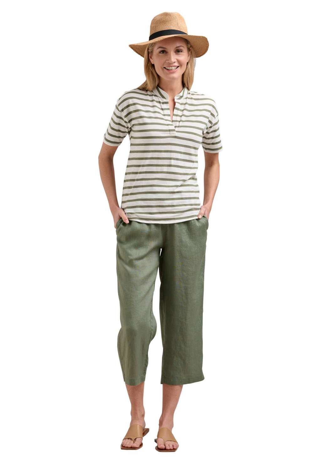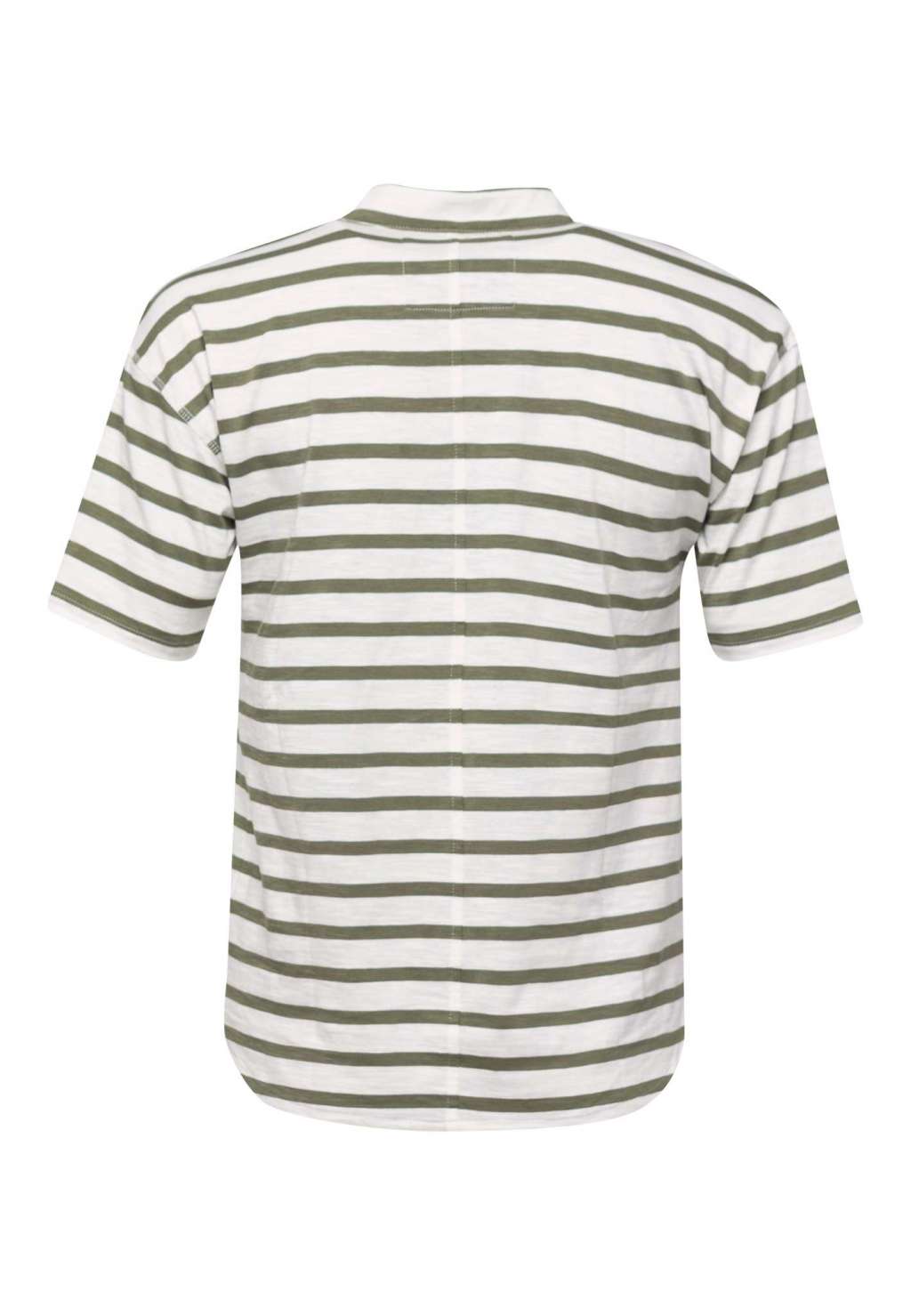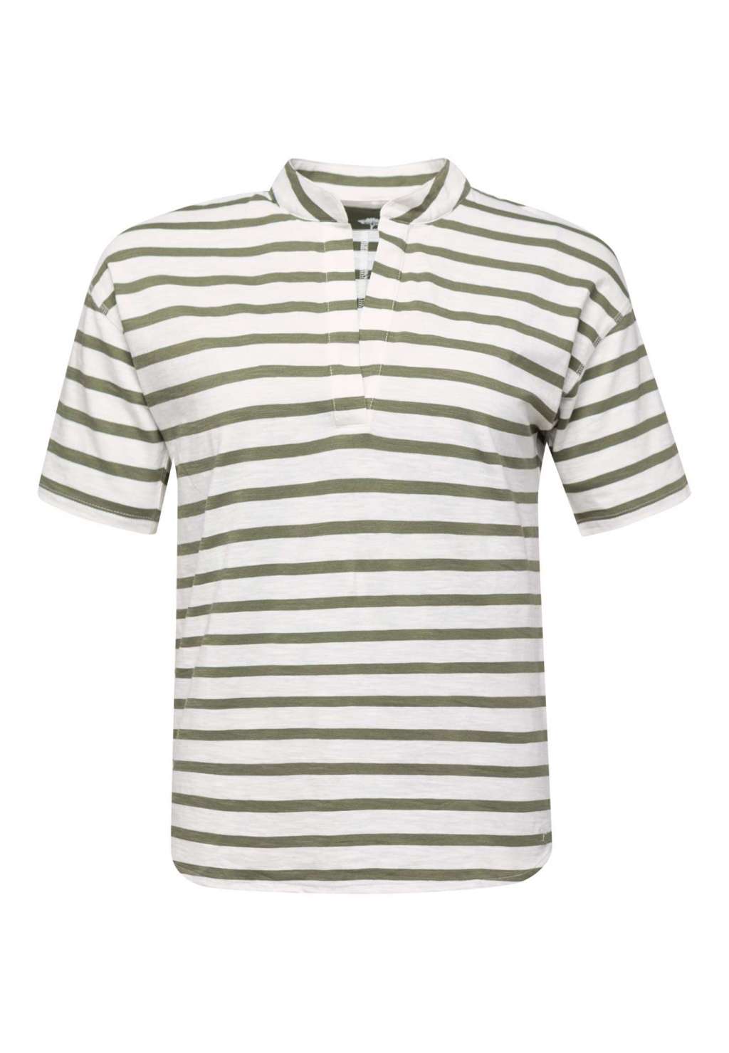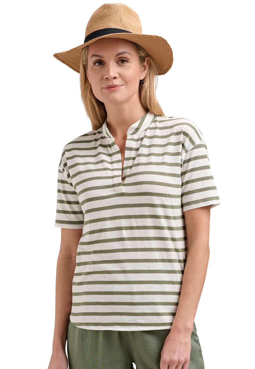 Damska koszulka firmy Fynch-Hatton w kolorze mlecznym w oliwkowe paski. Świetna, prosta koszulka wykonana w 100% z miękkiej bawełny. Zaokrąglony dół i ciekawy dekolt w kształcie litery V z kołnierzykiem typu stójka doskonale wpisuje się do swobodnego, letniego outfitu.
