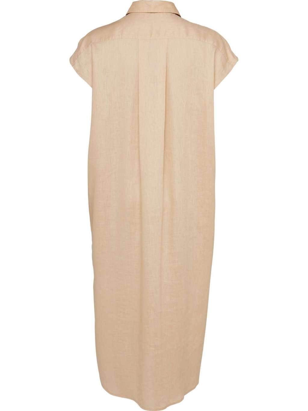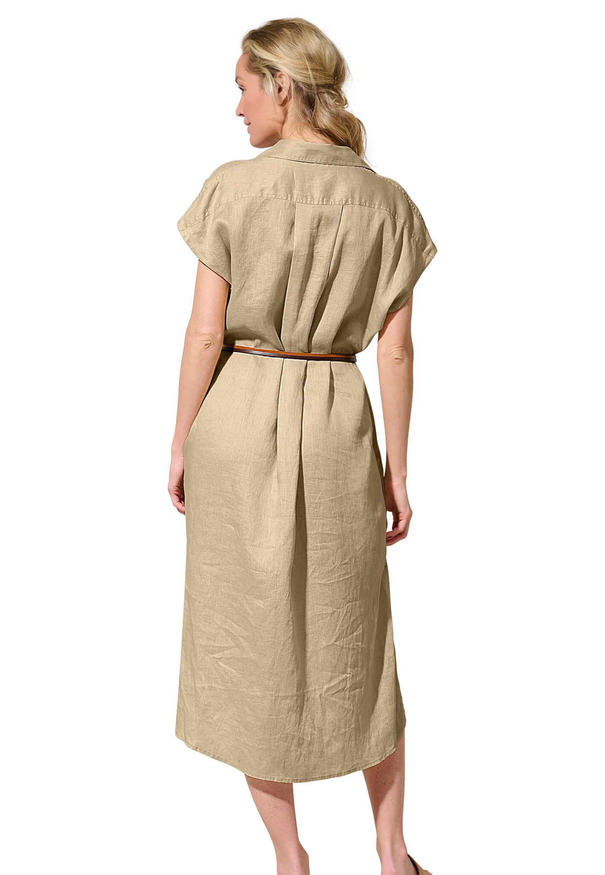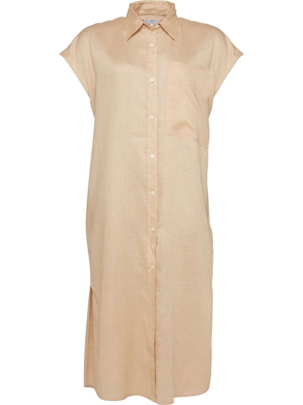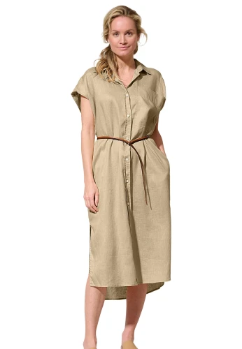 Sukienka firmy Fynch-Hatton w kolorze piaskowym. Wygodna, luźna sukienka, zapinana na guziki, wykonana z lnu. Prosty fason z klasycznym kołnierzem i ściętymi rękawkami wpisuje się w niezobowiązujący, letni styl. Przewiewna, lniana tkanina sprawia, że niezależnie od tego czy nosisz ją jako sukienka, czy jako koszula czujesz się wyśmienicie.