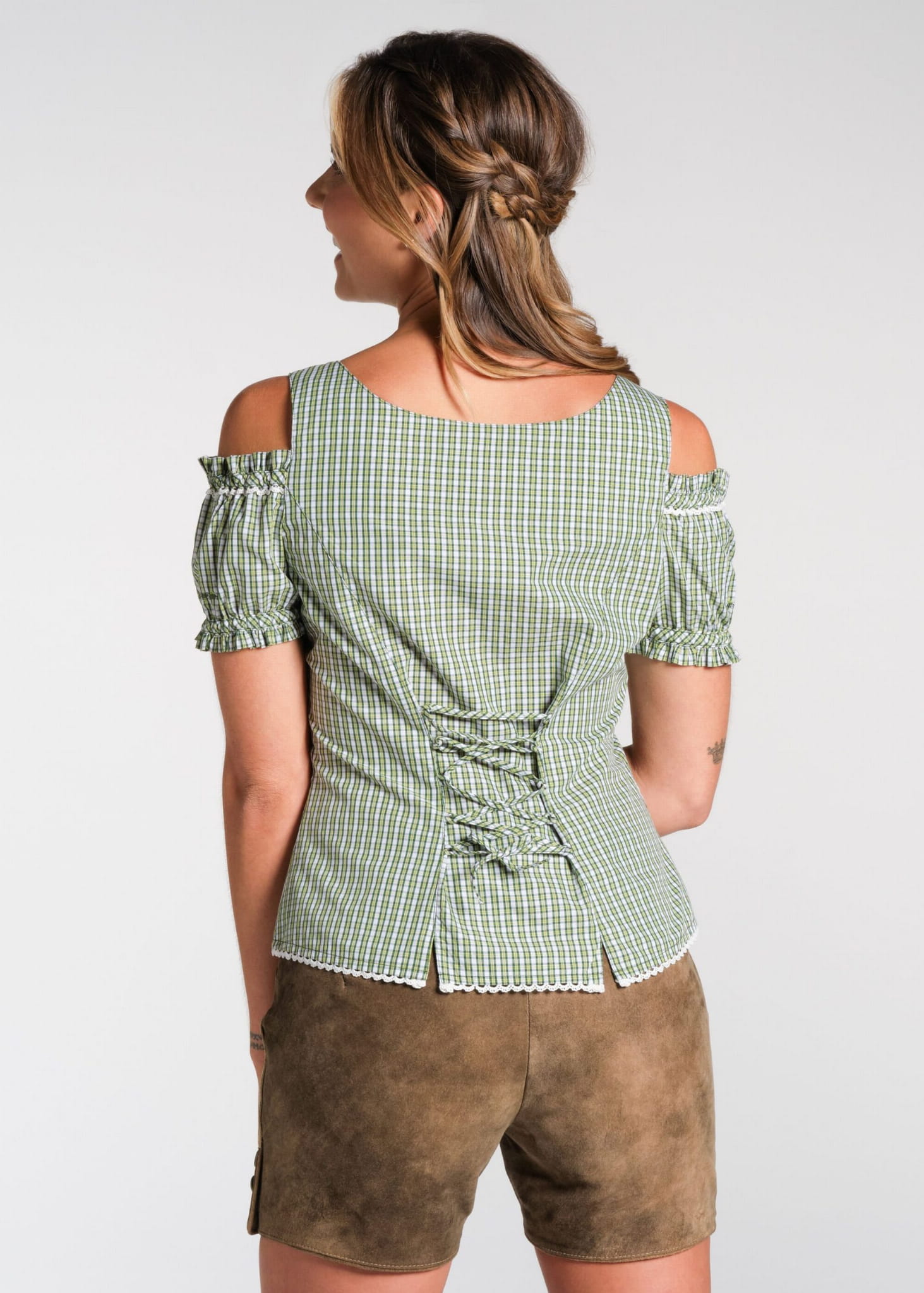 Bluzka damska NIERSBACH w kolorze zielonym. Śliczna, kraciasta bluzka w typie Carmen z opuszczanymi rękawkami i regulowanymi ramiączkami. Dobrze dopasowuje się do sylwetki dzięki regulacji z tyłu.