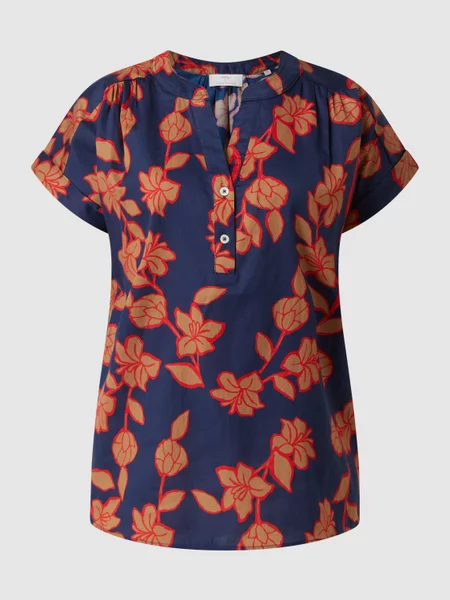 Bluzka firmy Fynch-Hatton w kolorze granatowym, ze wzorem w kwiaty. Subtelna, lekka bluzka, idealna na okres letni. Dekolt w kształcie litery V, zapinany na dwa guziczki połączony ze stójką wyśmienicie podkreśli i wydłuży szyję dodając wdzięku i seksapilu. Klasyczna bluzka w nowej odsłonie doskonale sprawdzi się w połączeniu z żakietem, damskim garniturem lub garsonką.