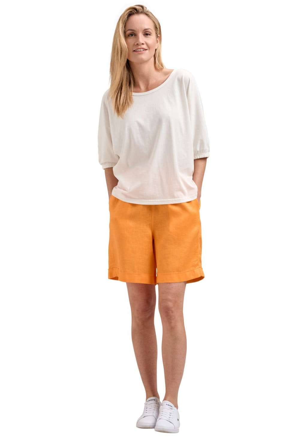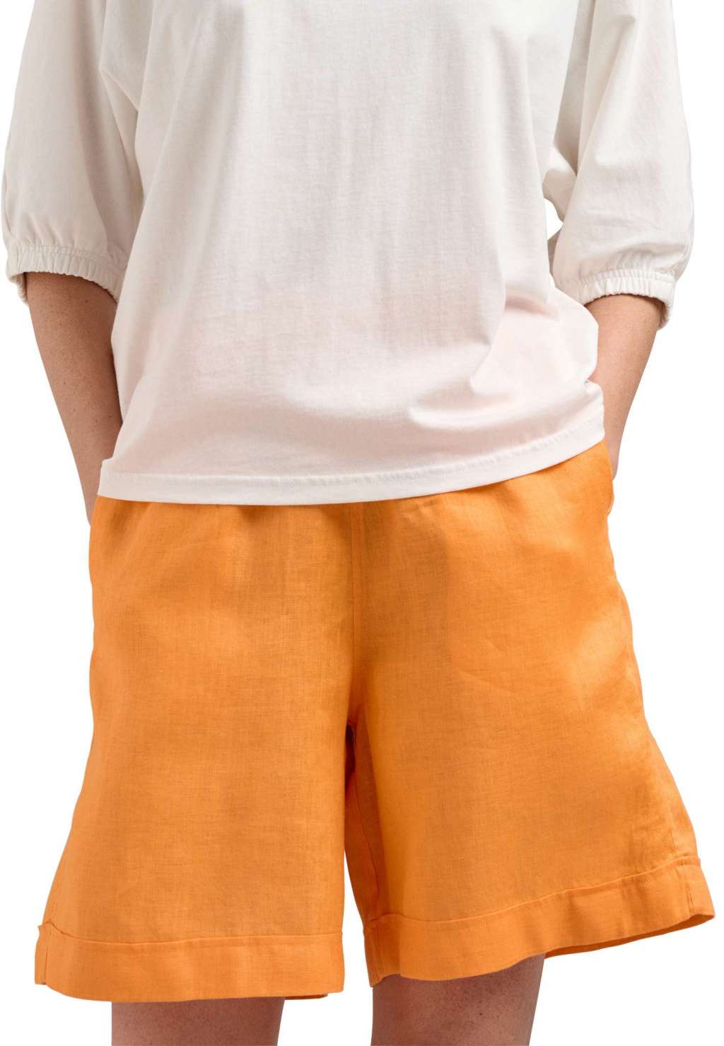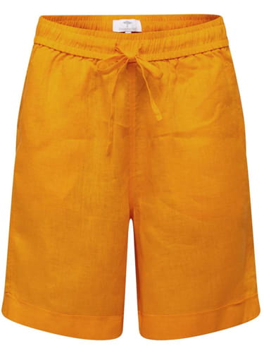 Krótkie, lniane spodnie marki FYNCH-HATTON w kolorze mango. Letnie, lekkie, wygodne i uniwersalne w jednym. Spodnie ze średnim stanem, elastycznym pasem na wiązanie i prostą nogawką. Idealnie wpisują się w letnie klimaty.
