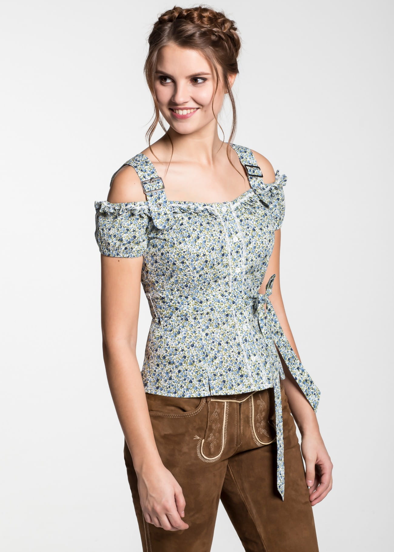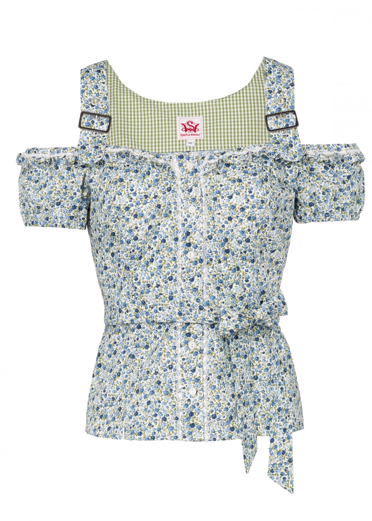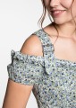 - Dekolt i listwa guzikowa obszyta białą koronką