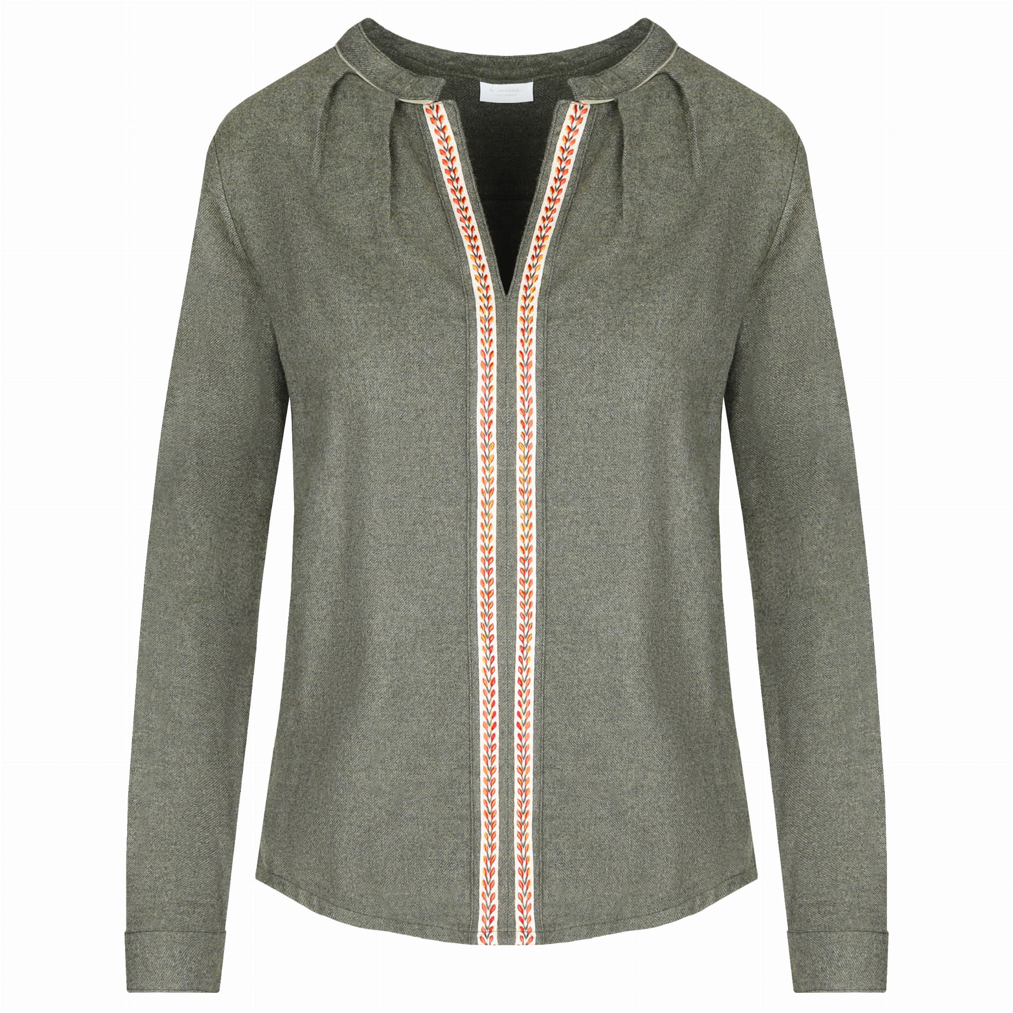 Bluzka damska WARTH w kolorze zielonym - sosna morska. Bluzka z długim rękawem, dekolt w serek i pięknym ozdobnym haftem. Posiada guziki przy rękawach, Przyjemna w dotyku. Efektownie się prezentuje.