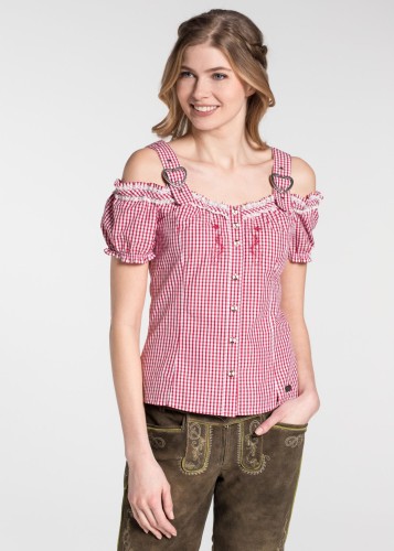 Bluzka damska KARIBIK w kolorze czerwonym. Śliczna, kraciasta bluzka w typie Carmen z opuszczanymi rękawkami i regulowanymi ramiączkami. Dobrze dopasowuje się do sylwetki dzięki regulacji z tyłu.