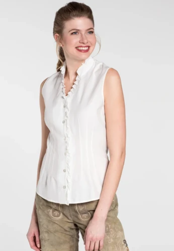 Bluzka damska KLARINETTE w kolorze kremowym. Kobieca bluzka bez rękawów z pięknie wykończony dekoltem.