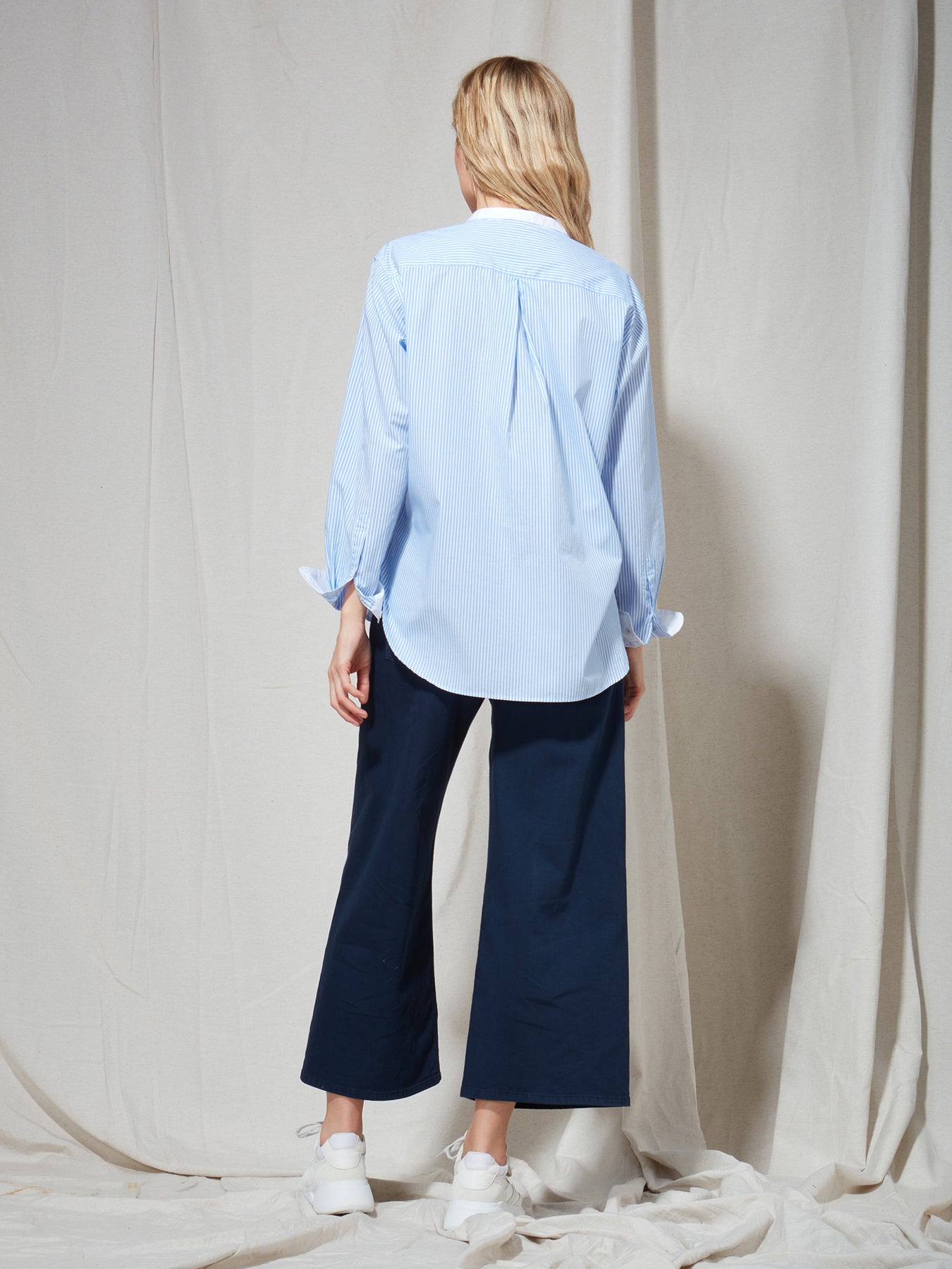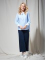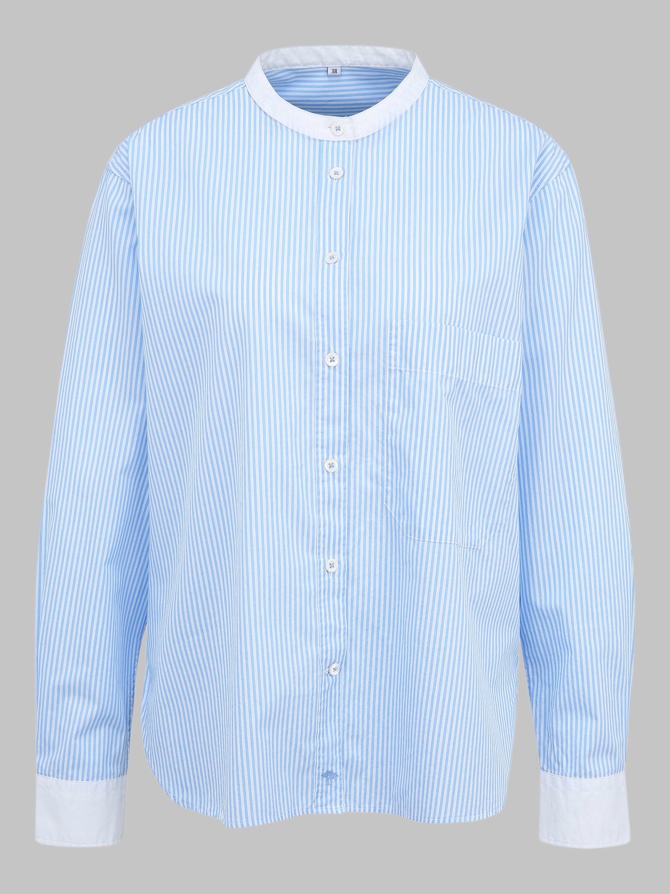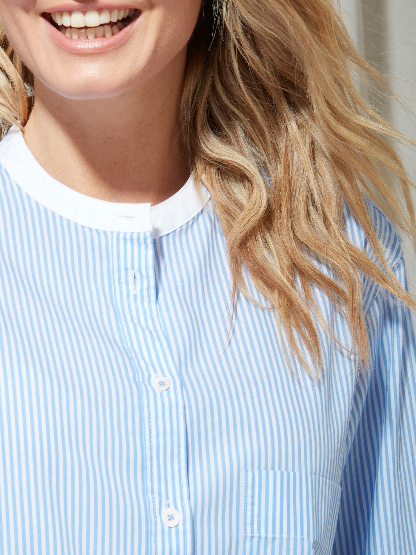 Elegancka bluzka wykonana z miękkiej bawełny zapewnia wygodę noszenia. Bluzka posiada delikatny wzór, jest w biało-niebieskie paski, stójka oraz mankiety są białe. Koszula jest zapinana na guziki z przedłużonym tyłem oraz dużą naszywaną kieszenią na piersi.