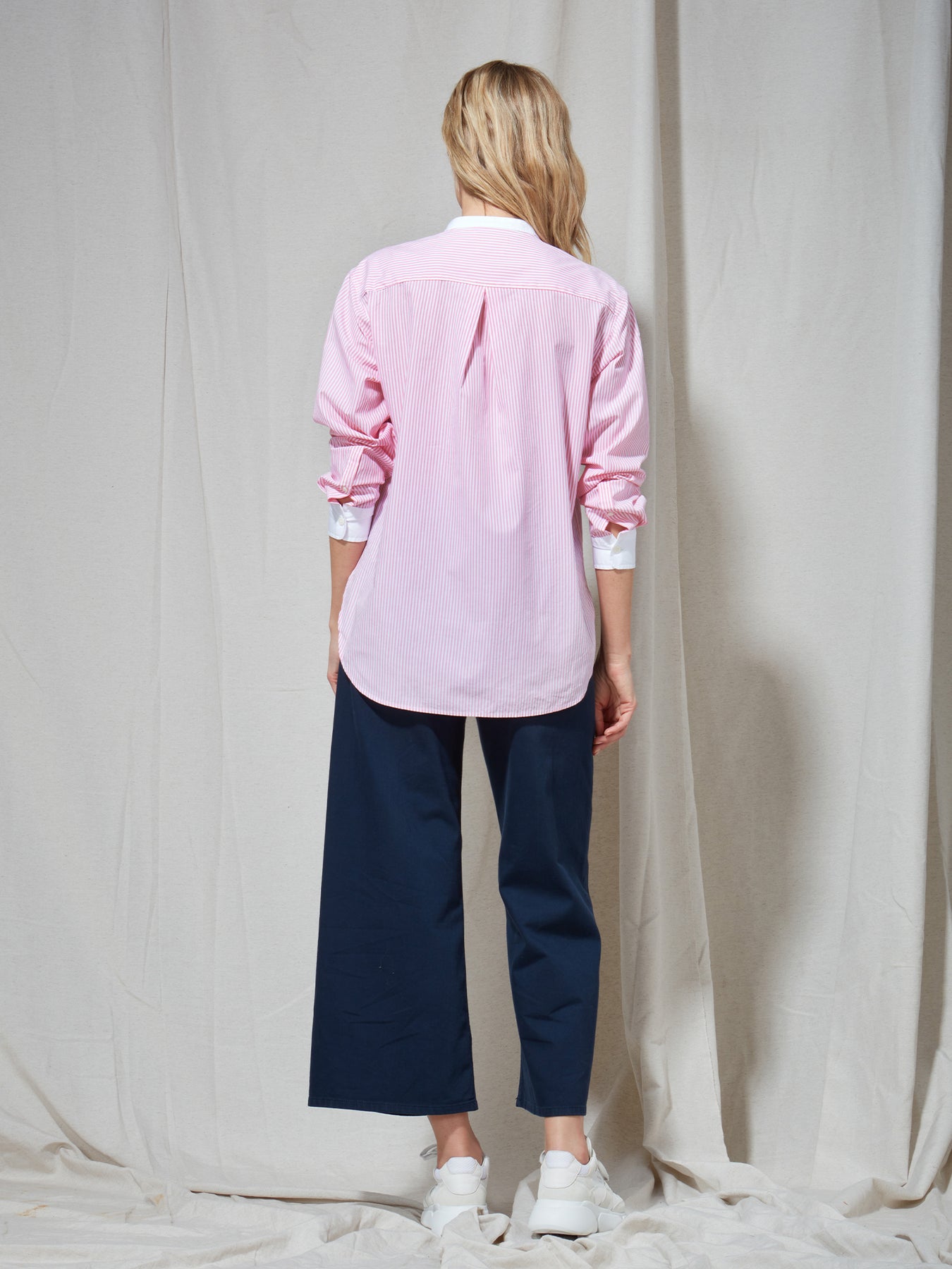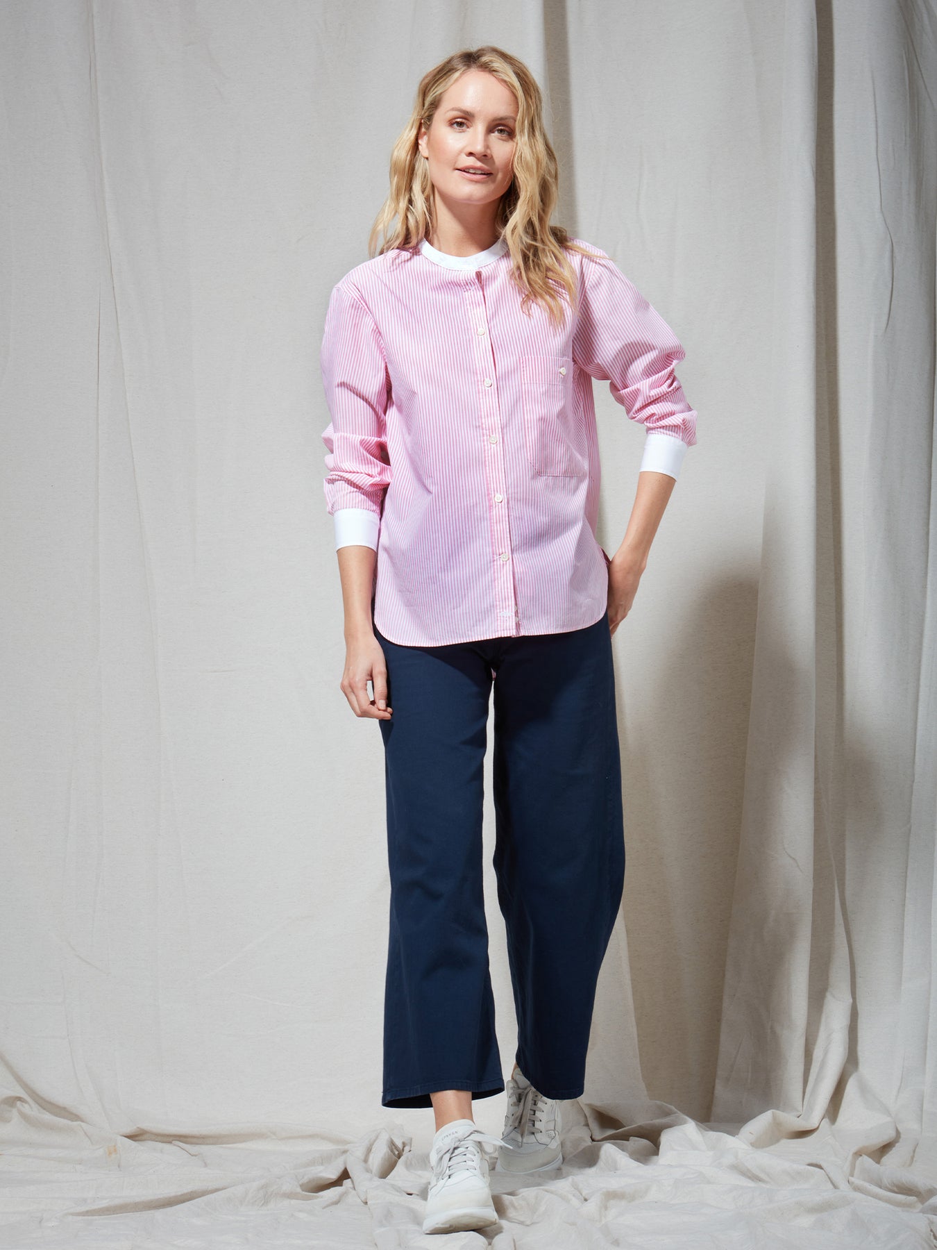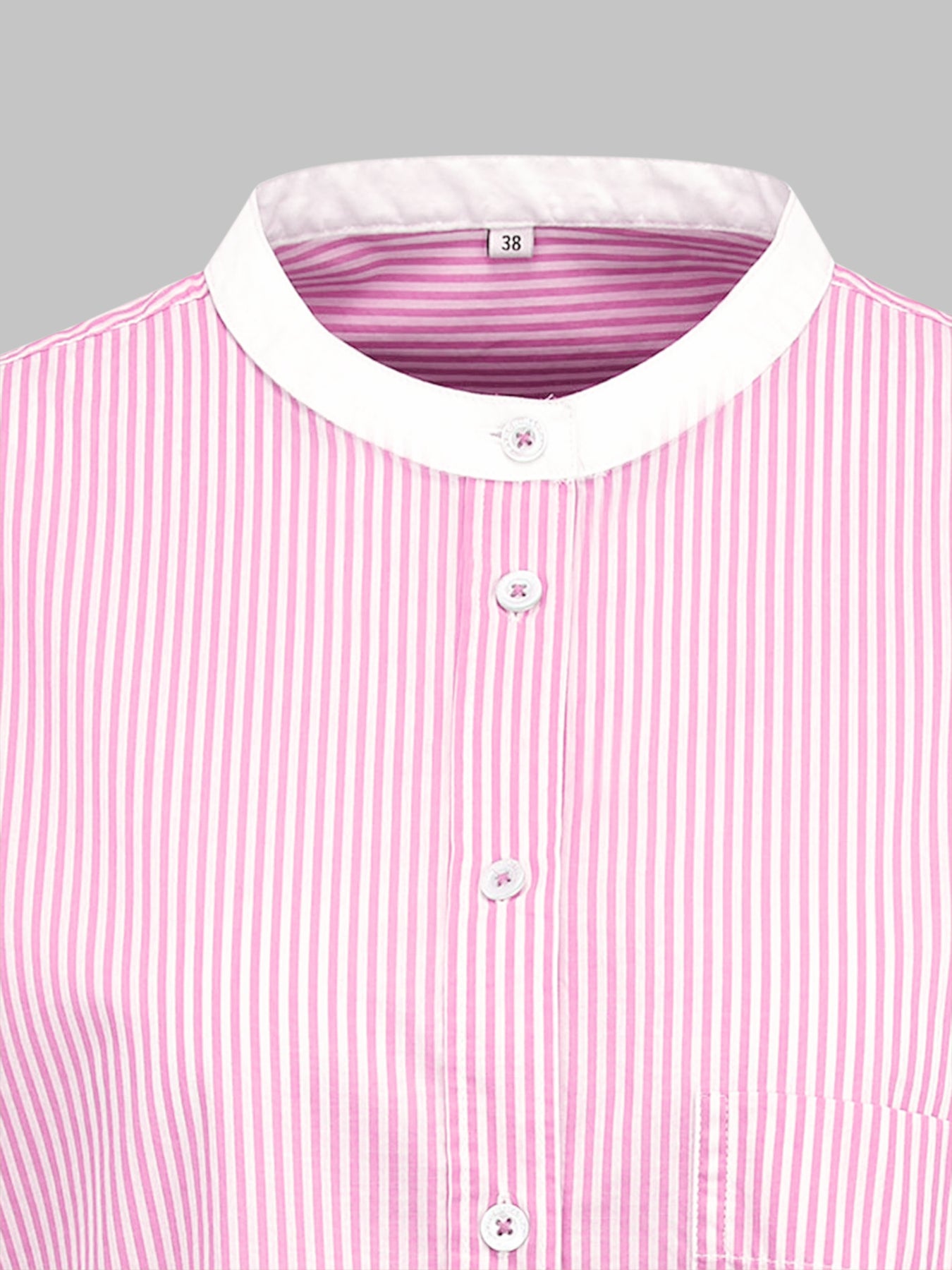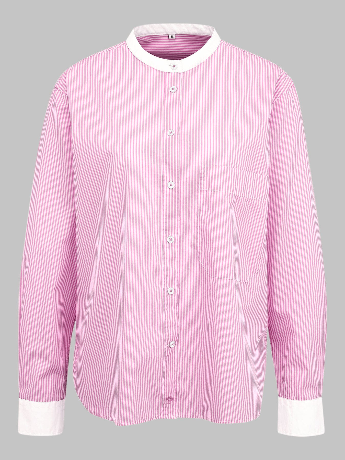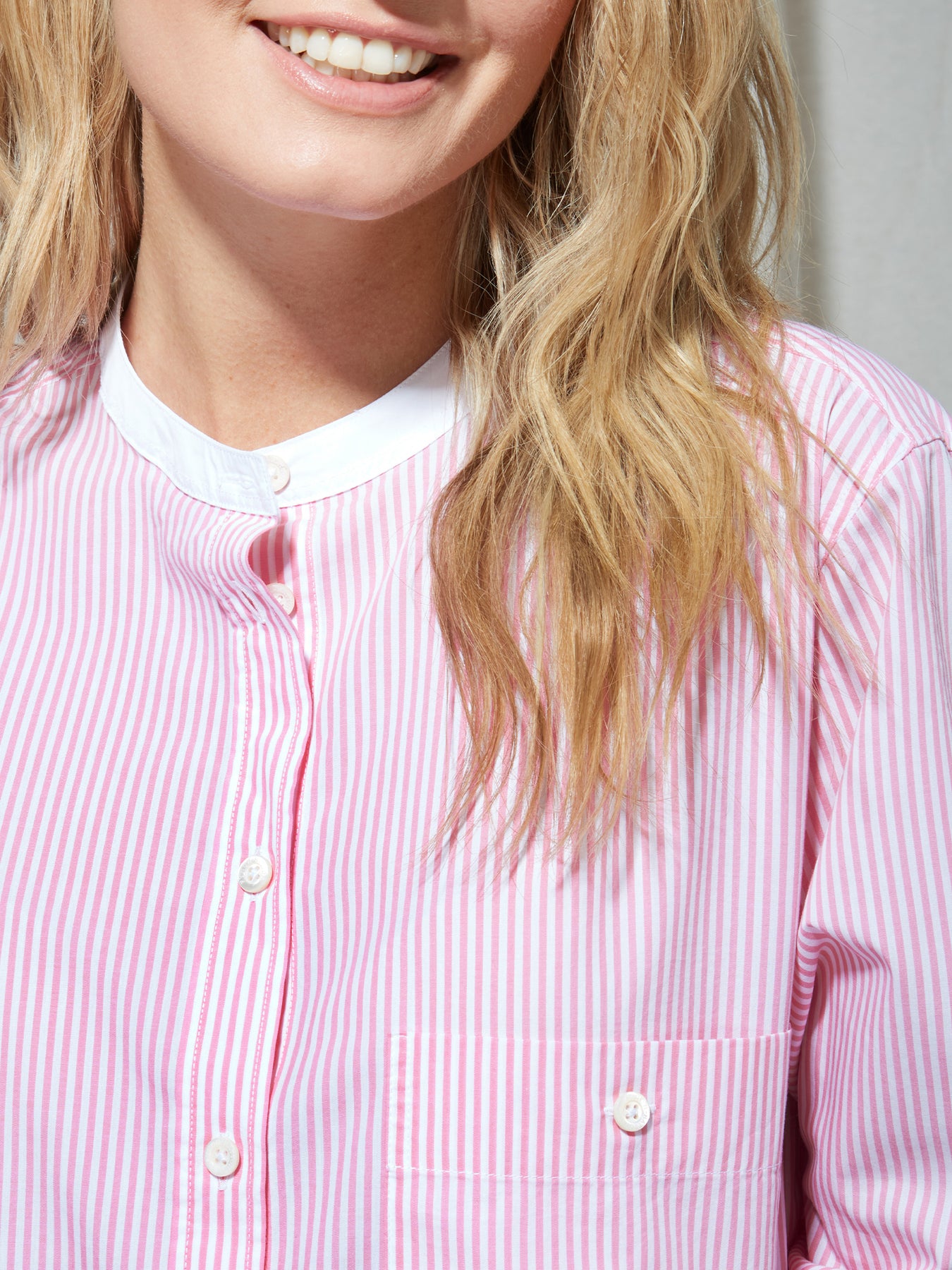 Elegancka bluzka wykonana z miękkiej bawełny zapewnia wygodę noszenia. Bluzka posiada delikatny wzór, jest w biało-różowe paski, stójka oraz mankiety są białe. Koszula jest zapinana na guziki z przedłużonym tyłem oraz dużą naszywaną kieszenią na piersi.