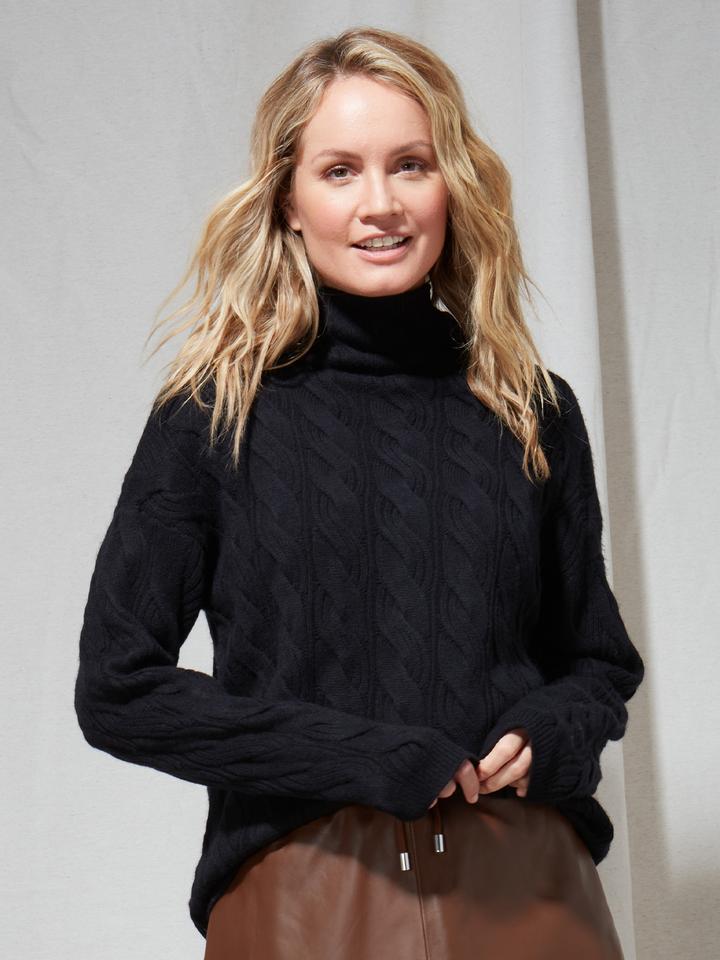 Klasyczny sweter z golfem w nowoczesnej interpretacji. Elegancki wzór warkoczowy oraz przyjemna i ciepła mieszanka wełny i kaszmiru to ponadczasowy szyk i klasa. Sweter doskonale komponuje się z legginsami, spódnicami oraz spodniami i jeansami. Idealny zarówno do pracy, od święta jak i na co dzień.