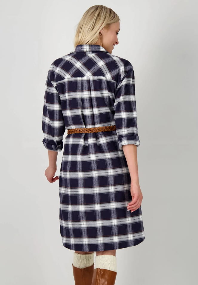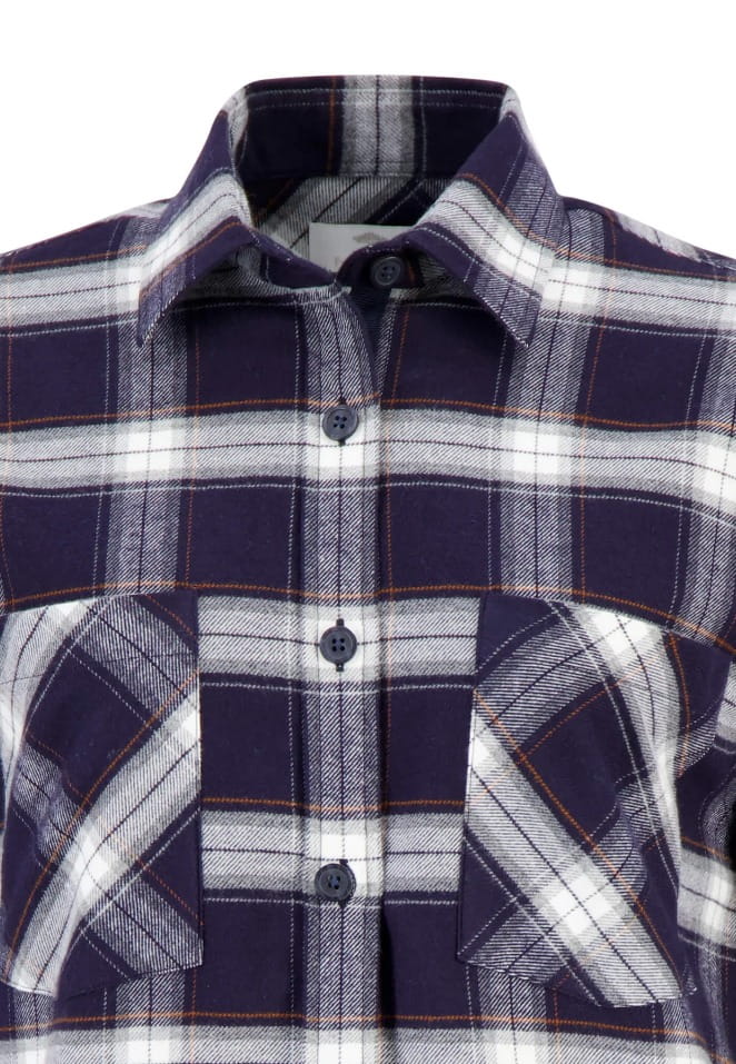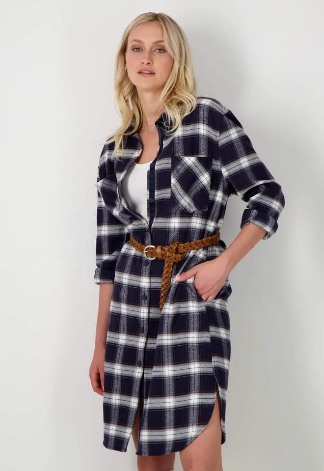 Sukienka koszulowa z długim rękawem od FYNCH-HATTON w granatową kratę. Zapinana w całości na guziki jest idealna na zimę dzięki ciepłej, flanelowej tkaninie. Modny wzór w kratę oraz naszywane kieszenie na piersi z patkami tworzą sportowy wygląd. Boczne kieszenie zapewniają dodatkowy komfort.