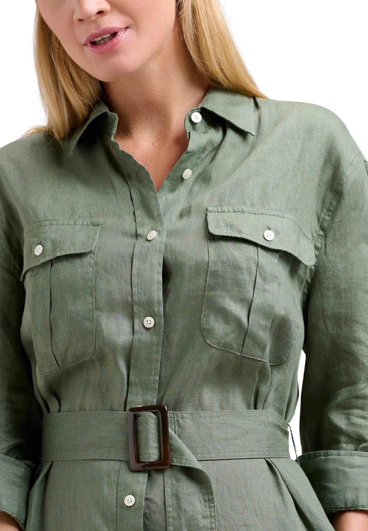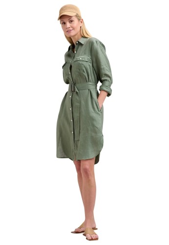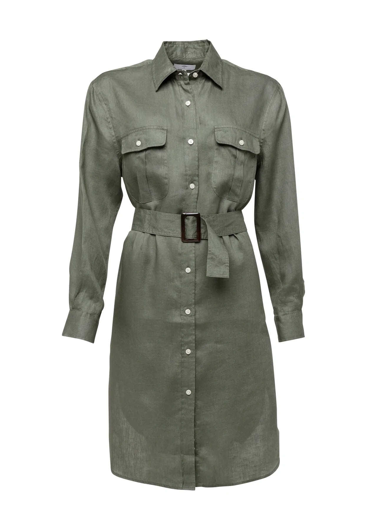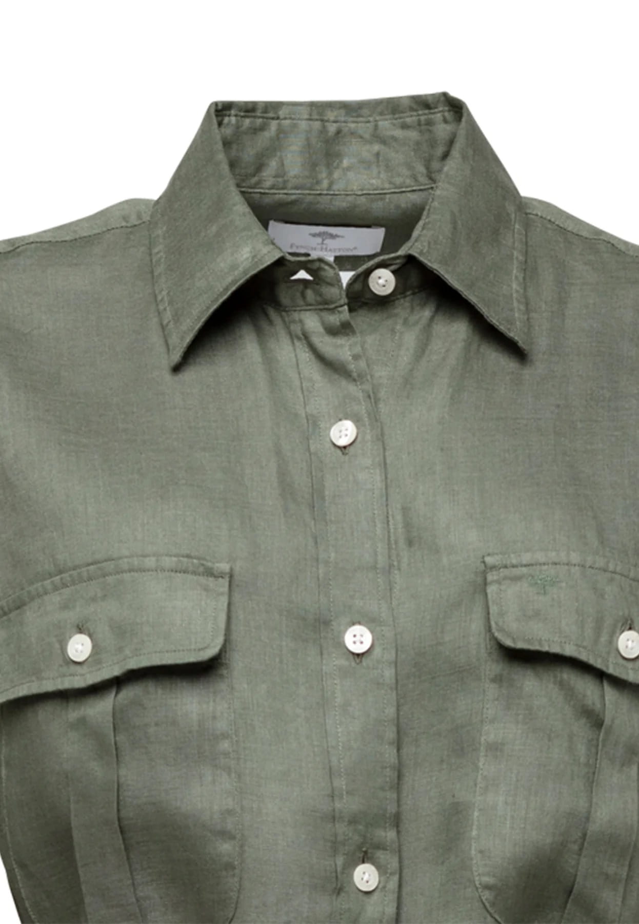 Sukienka koszulowa z długim rękawem od FYNCH-HATTON w kolorze oliwkowym. Zapinana w całości na guziki jest idealna na lato dzięki lekkiej, lnianej tkaninie. Pasek pozwala elastycznie zmieniać wygląd sukienki a naszywane kieszenie na piersi z patkami tworzą sportowy wygląd. Boczne kieszenie zapewniają dodatkowy komfort.