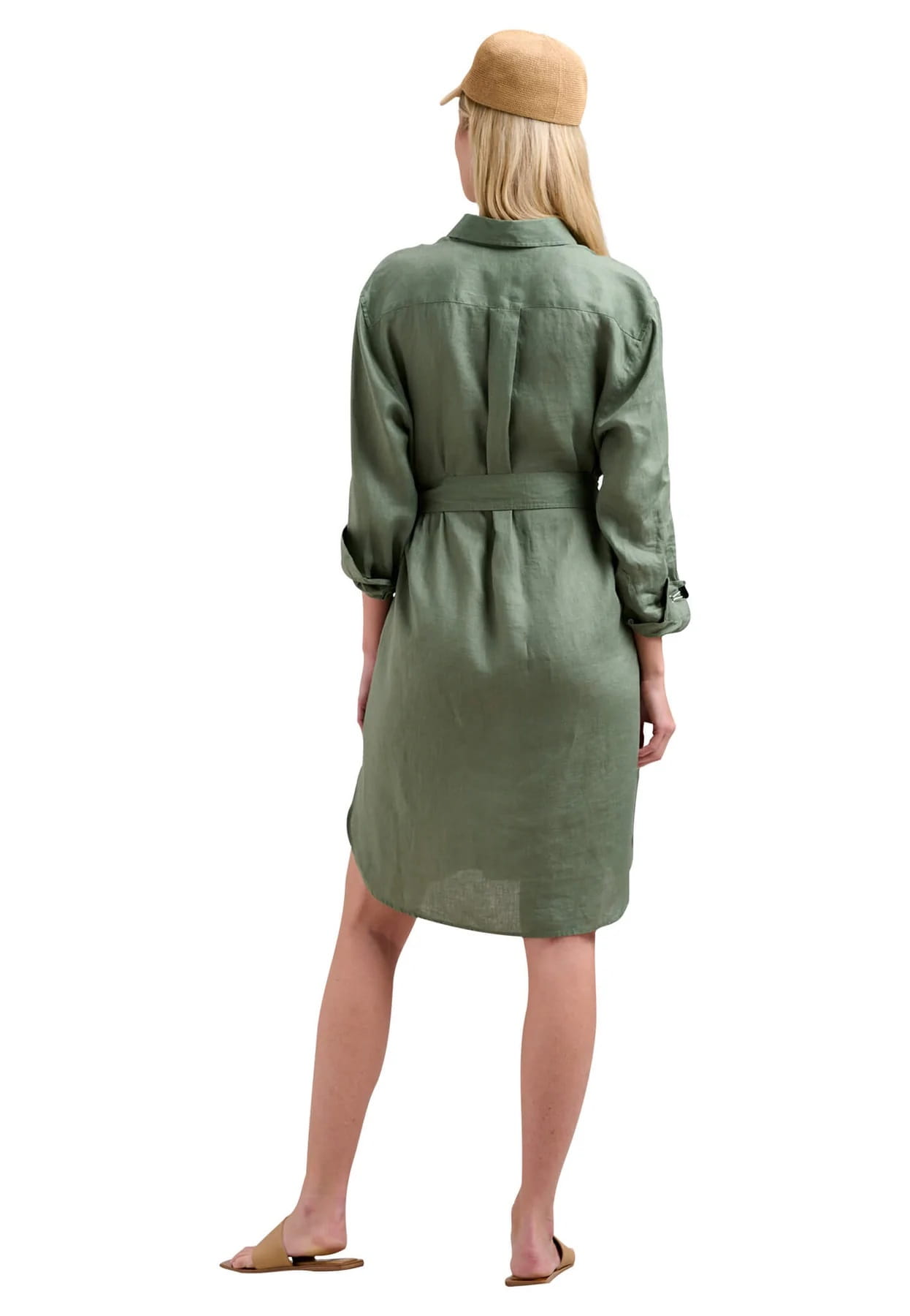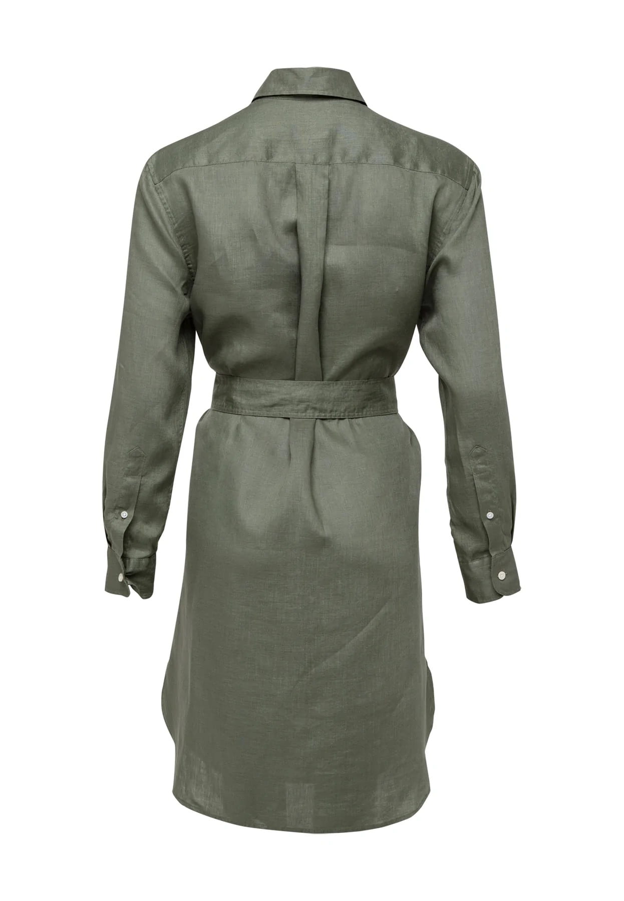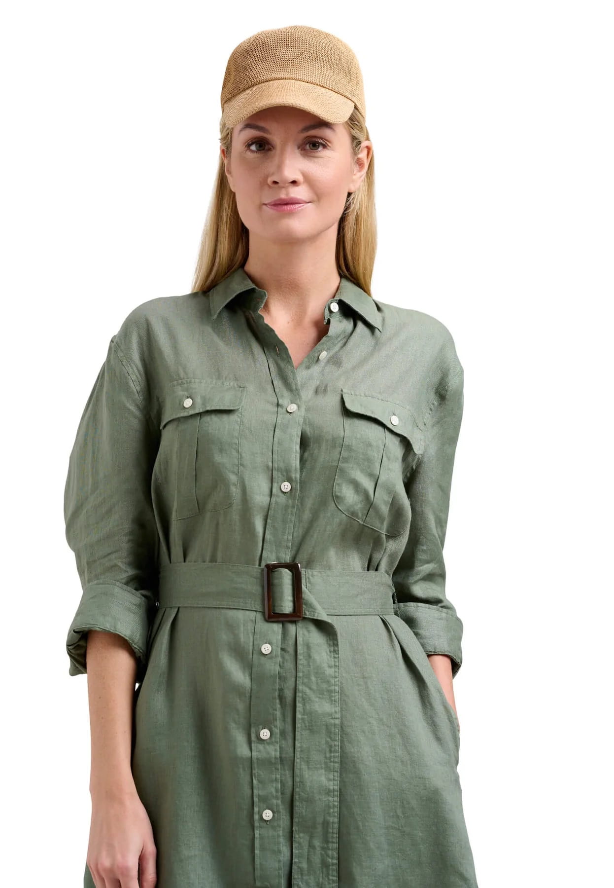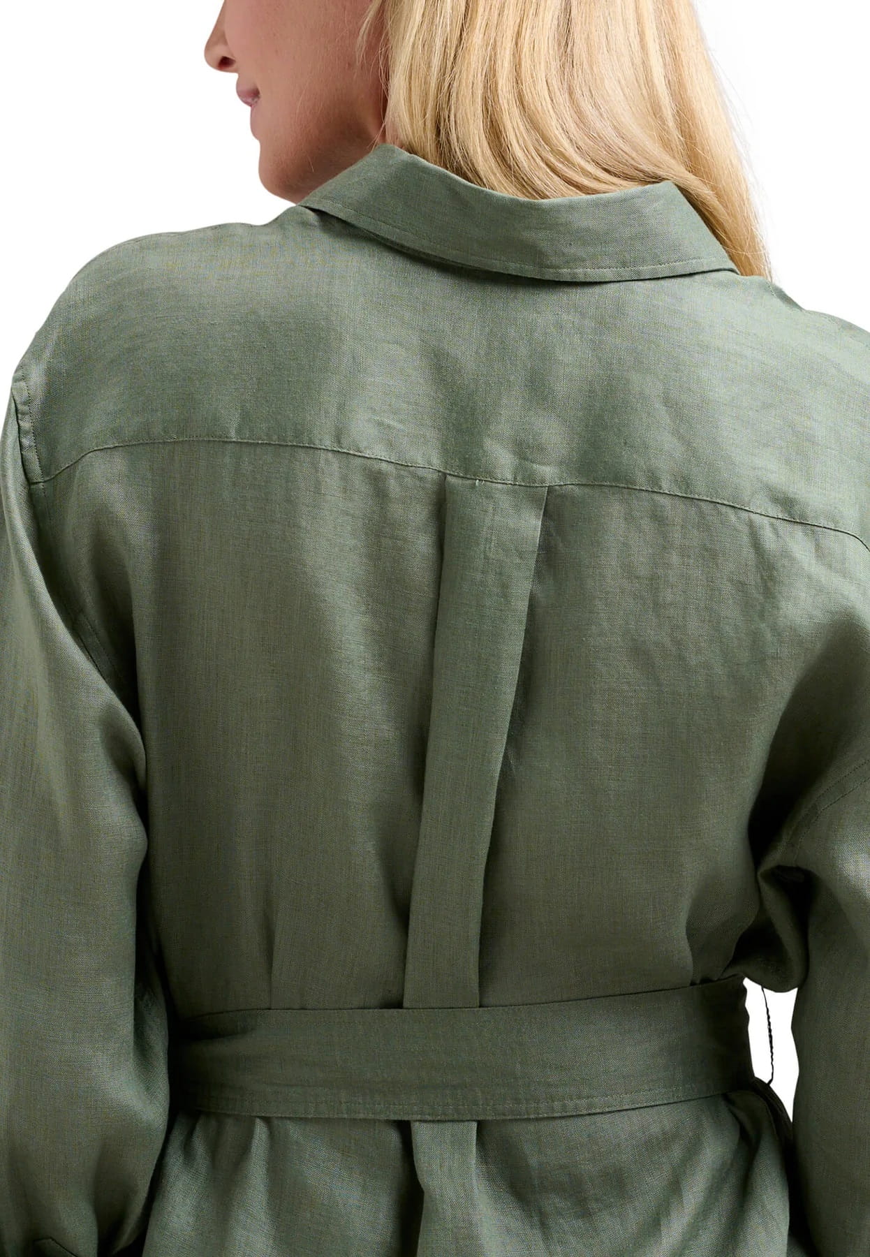 Sukienka koszulowa z długim rękawem od FYNCH-HATTON w kolorze oliwkowym. Zapinana w całości na guziki jest idealna na lato dzięki lekkiej, lnianej tkaninie. Pasek pozwala elastycznie zmieniać wygląd sukienki a naszywane kieszenie na piersi z patkami tworzą sportowy wygląd. Boczne kieszenie zapewniają dodatkowy komfort.