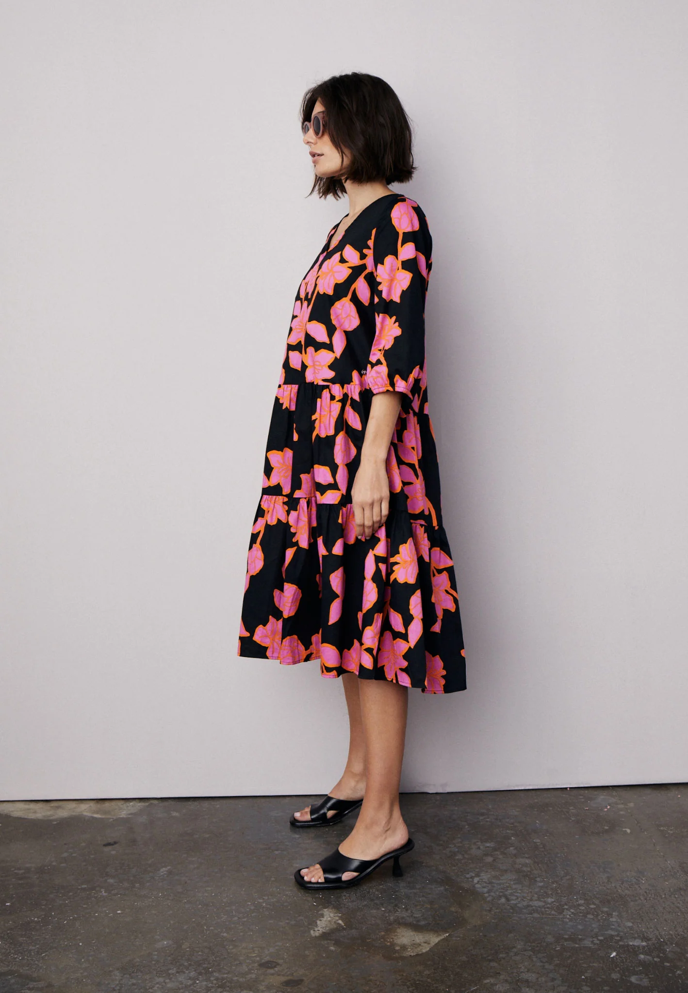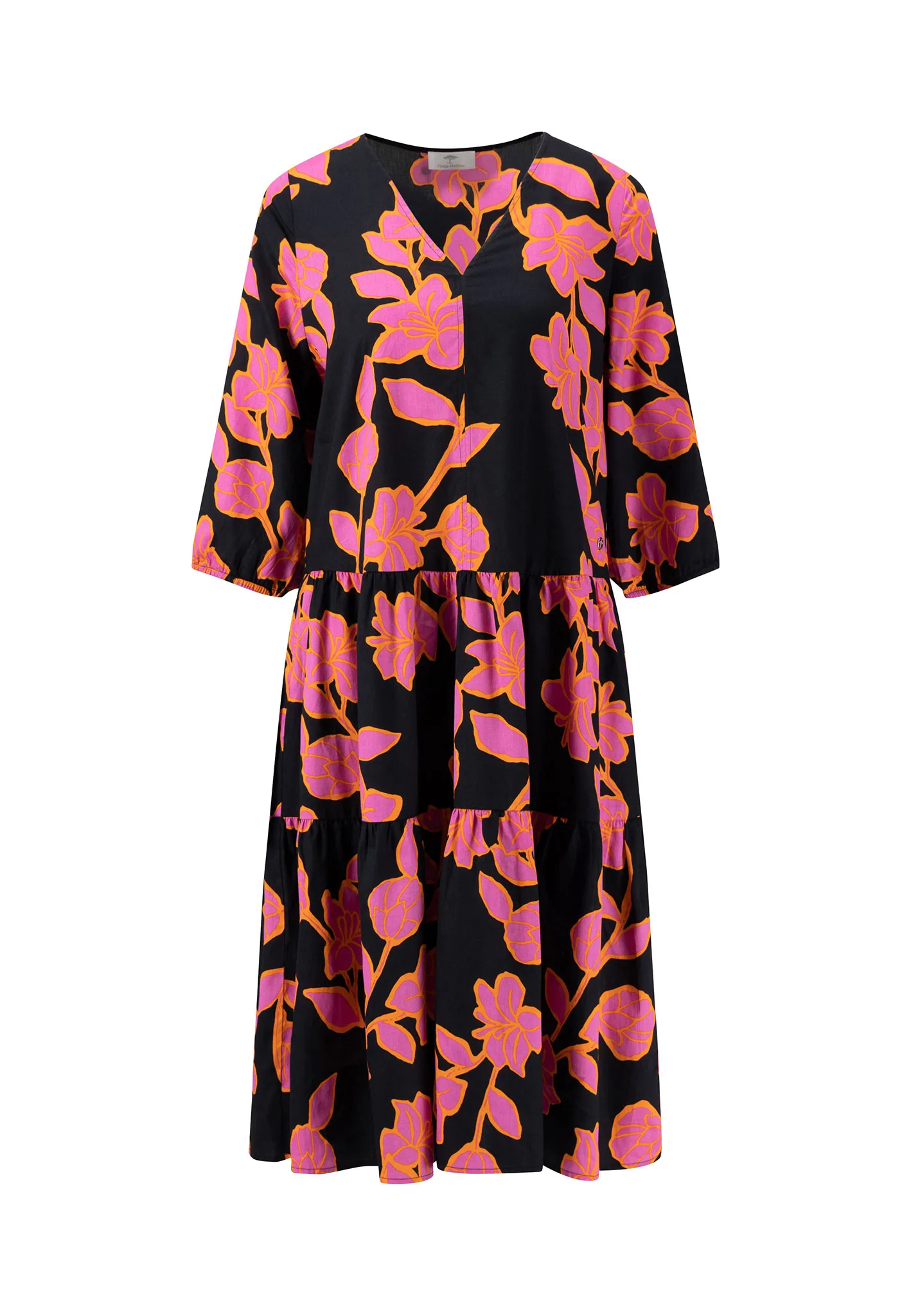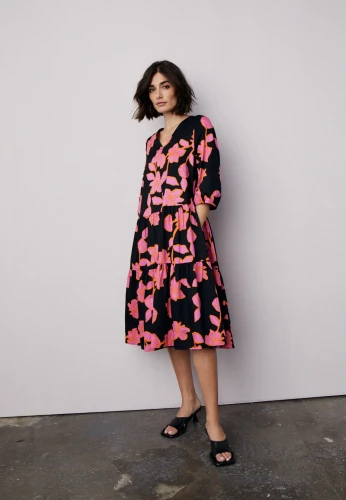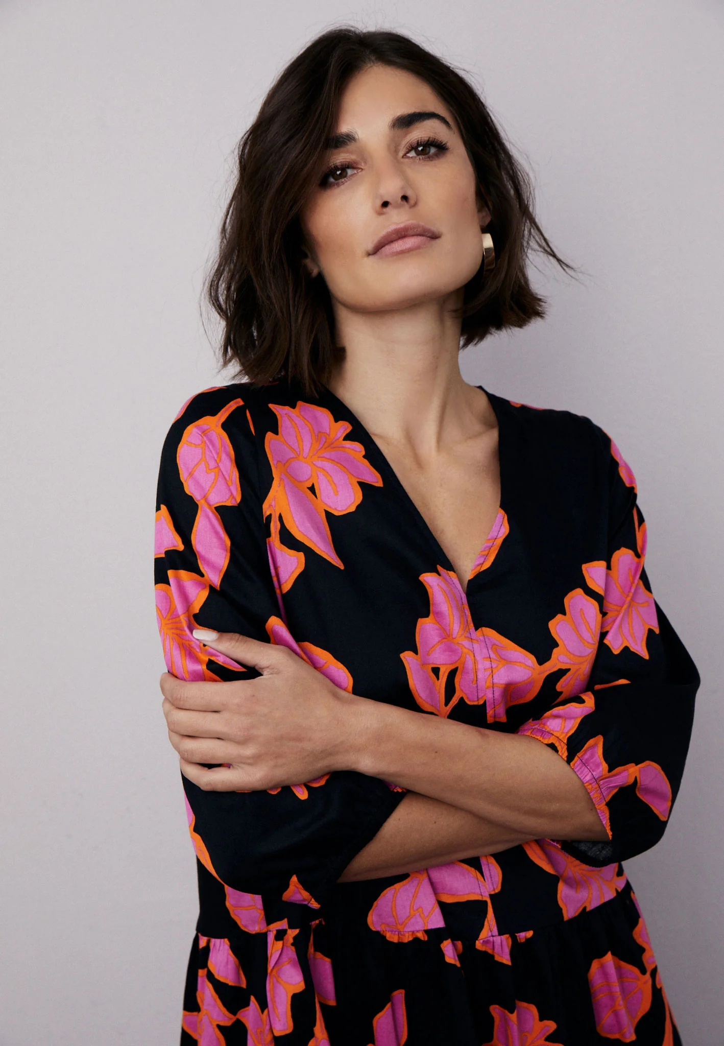 Naszymi ulubieńcami lata są zdecydowanie zwiewne sukienki o luźnym kroju, wykonane z lekkich materiałów i ozdobione indywidualnymi detalami. Sukienka FYNCH-HATTON spełnia wszystkie trzy kryteria i wywołuje uśmiech na twarzy. Kwiatowy wzór w kolorze pomarańczowym i różowym wygląda szczególnie promiennie na czarnym tle. Gładka bawełna jest cudownie lekka, co w połączeniu z szerokim krojem i marszczonymi rękawami zapewnia przewiewność i wygodę. Specjalny skręt tworzą falbanki wzdłuż części spódnicy. Dekolt w kształcie litery V i podłużny szew z przodu dopełniają całości.