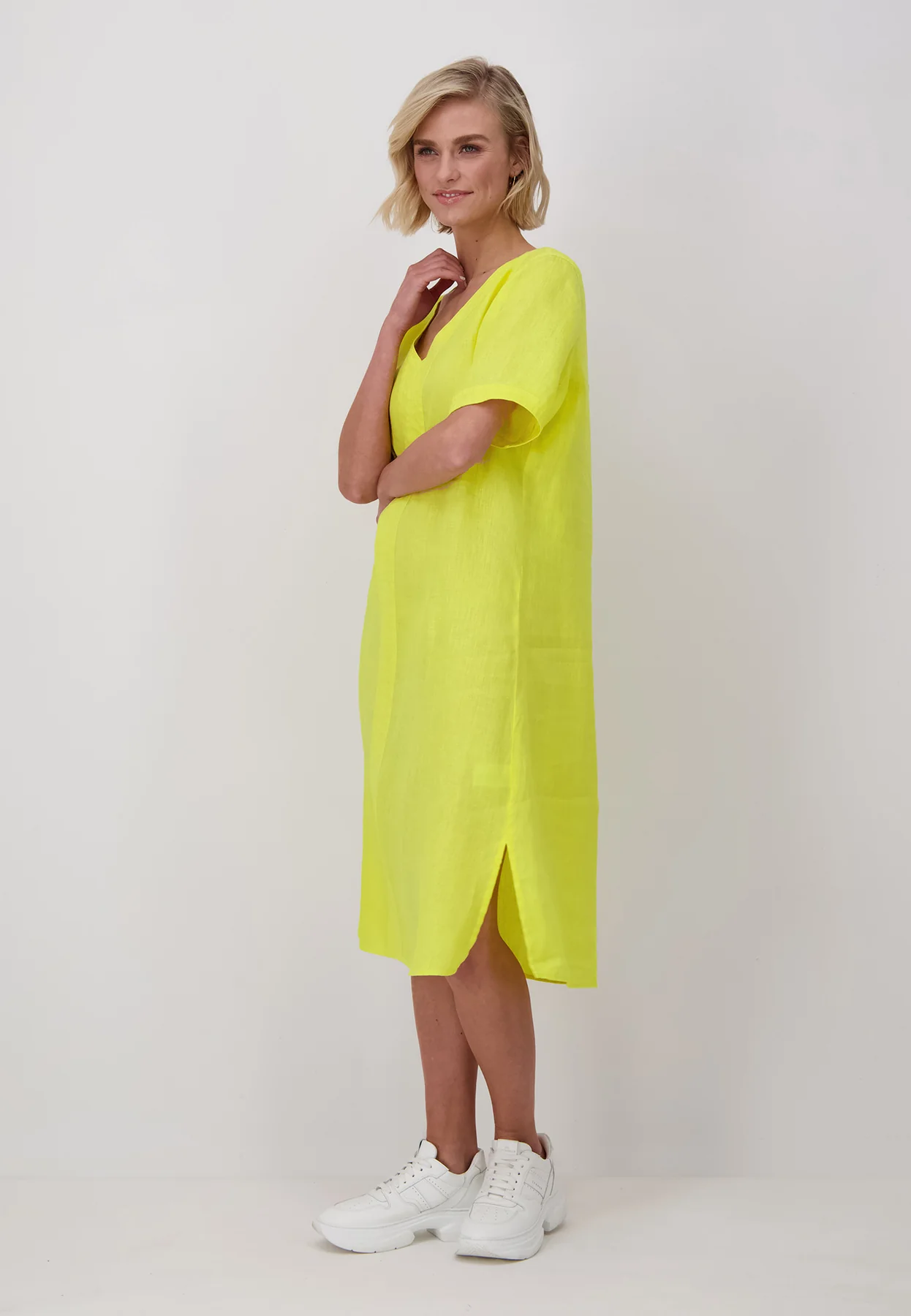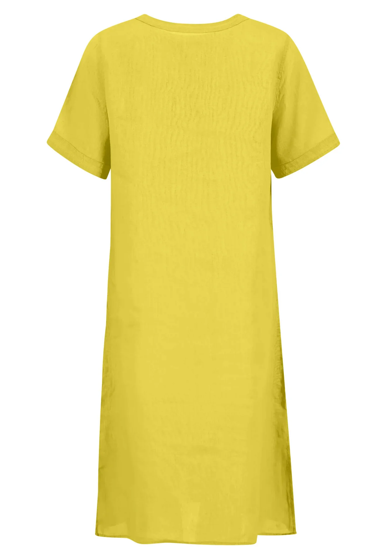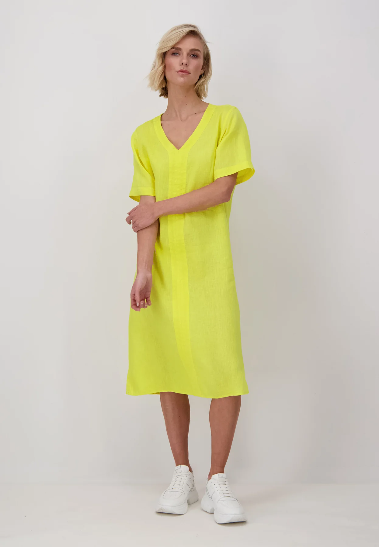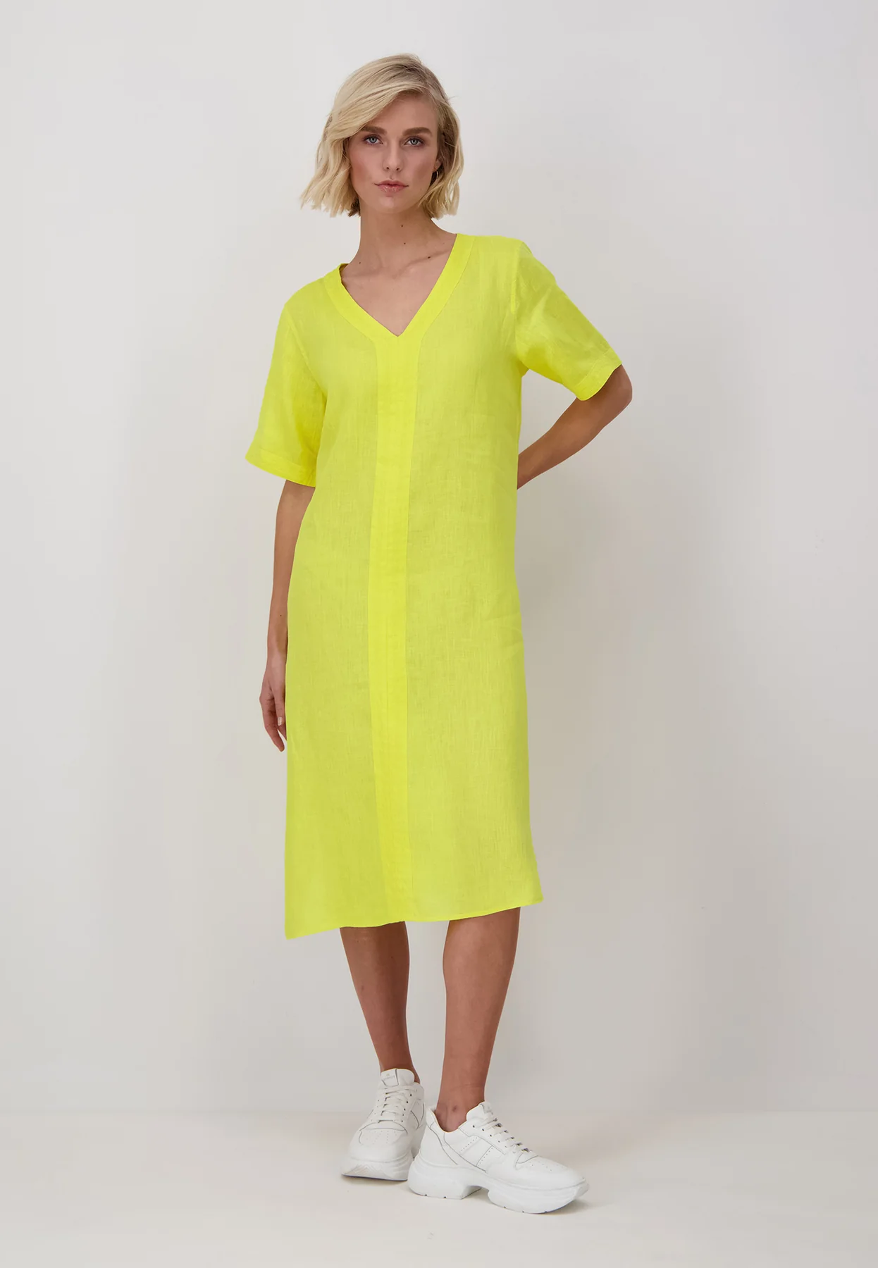 Lniana sukienka marki FYNCH-HATTON przekonuje, że mniej znaczy więcej. Prosty krój z szerokim dekoltem w literę V podkreśla ponadczasowy niezobowiązujący charakter sukienki. Szeroki ozdobny szew biegnący przez środek sukienki to sprytny detal, który tworzy śródziemnomorski klimat. Krótkie, szerokie rękawy i rozcięcia u dołu zapewniają przewiewność i swobodę ruchów. Wykonana z czystego lnu sukienka o długości midi jest naturalnie oddychająca i termoregulująca. Żółty kolor ożywa na przyjemnie lekkiej, lnianej tkaninie.