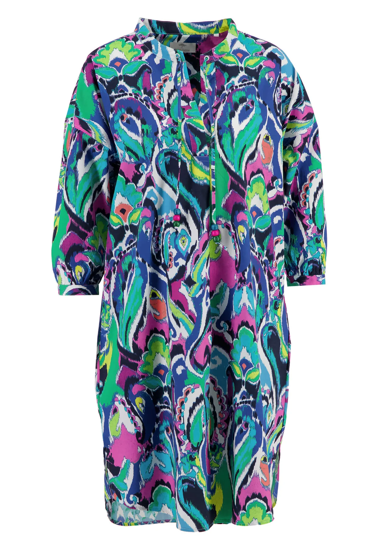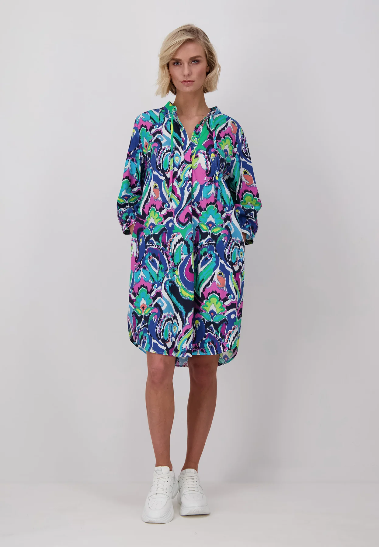Ta uderzająco wzorzysta sukienka firmy FYNCH-HATTON przyciąga wzrok wśród letnich sukienek i wnosi powiew świeżości do Twojej garderoby. Wykonana z czystej bawełny, jej lekka tekstura i swobodny krój sprawiają, że jest wygodna w noszeniu i nadaje się do noszenia na co dzień. Wiązany dekolt i boczne kieszenie nadają sukience sportowego charakteru, dzięki czemu można ją nosić zarówno z sandałami, jak i trampkami.