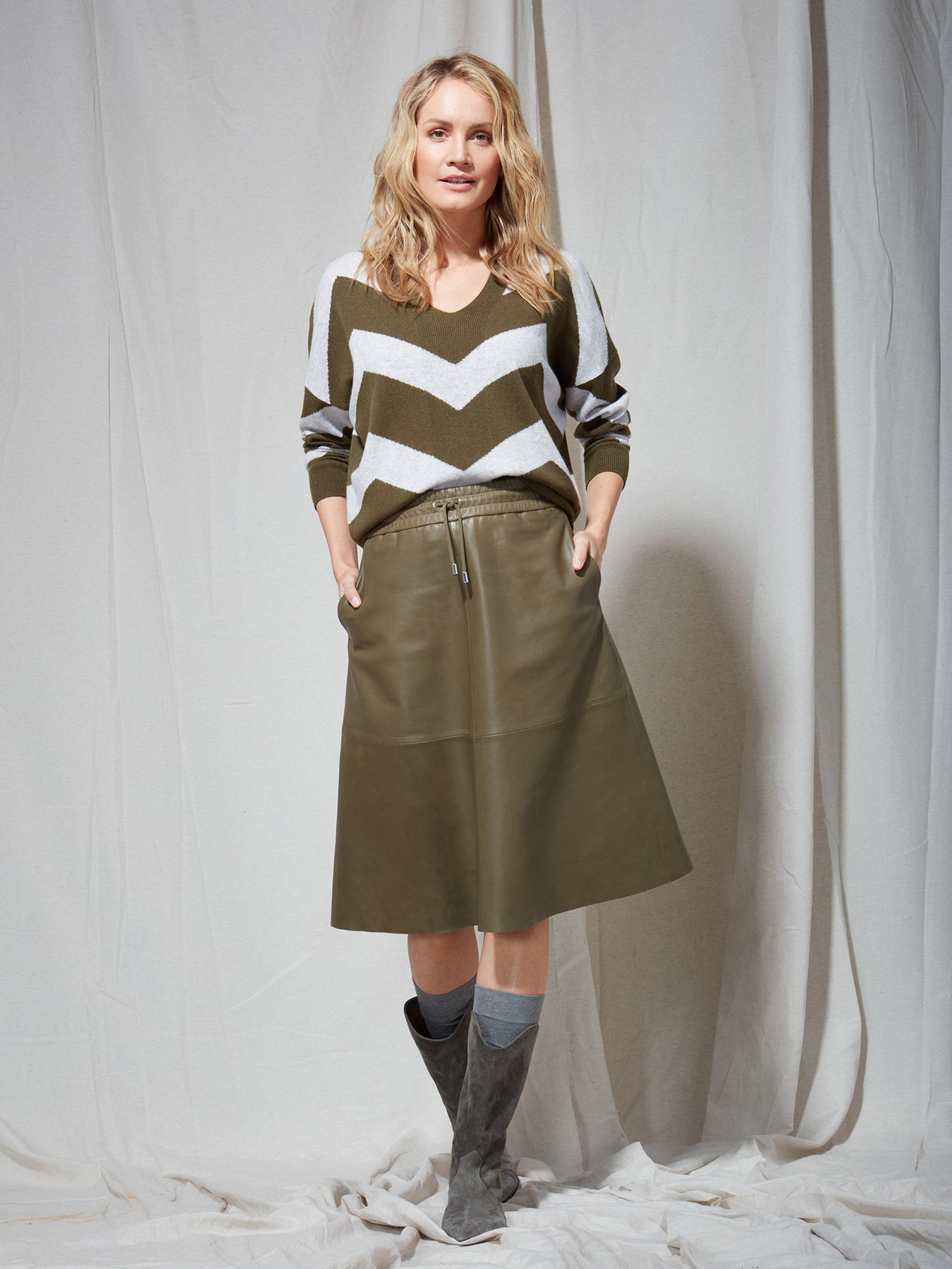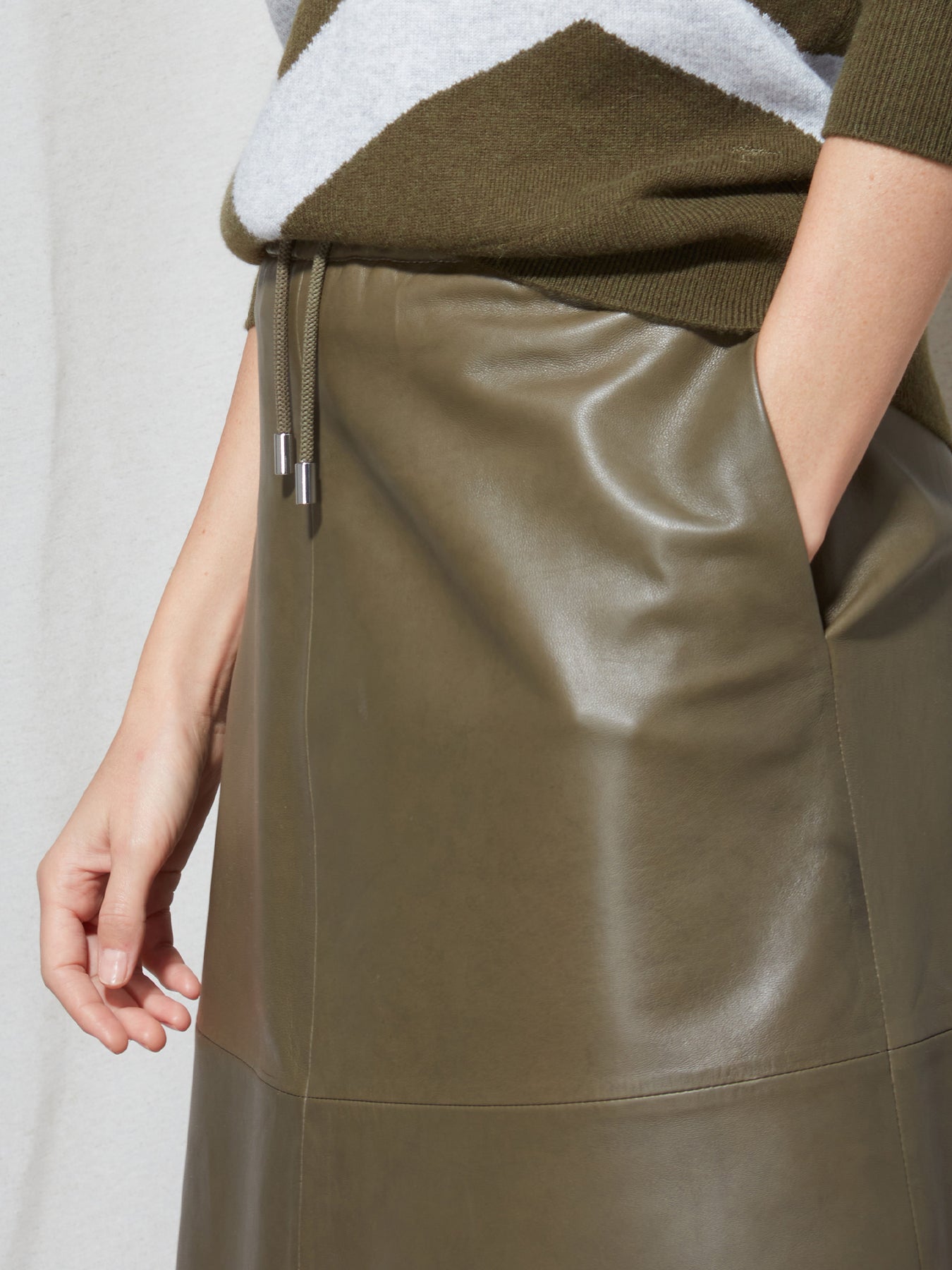Spódnica firmy FYNCH-HATTON jest wykonana w 100% ze skóry w kolorze khaki.