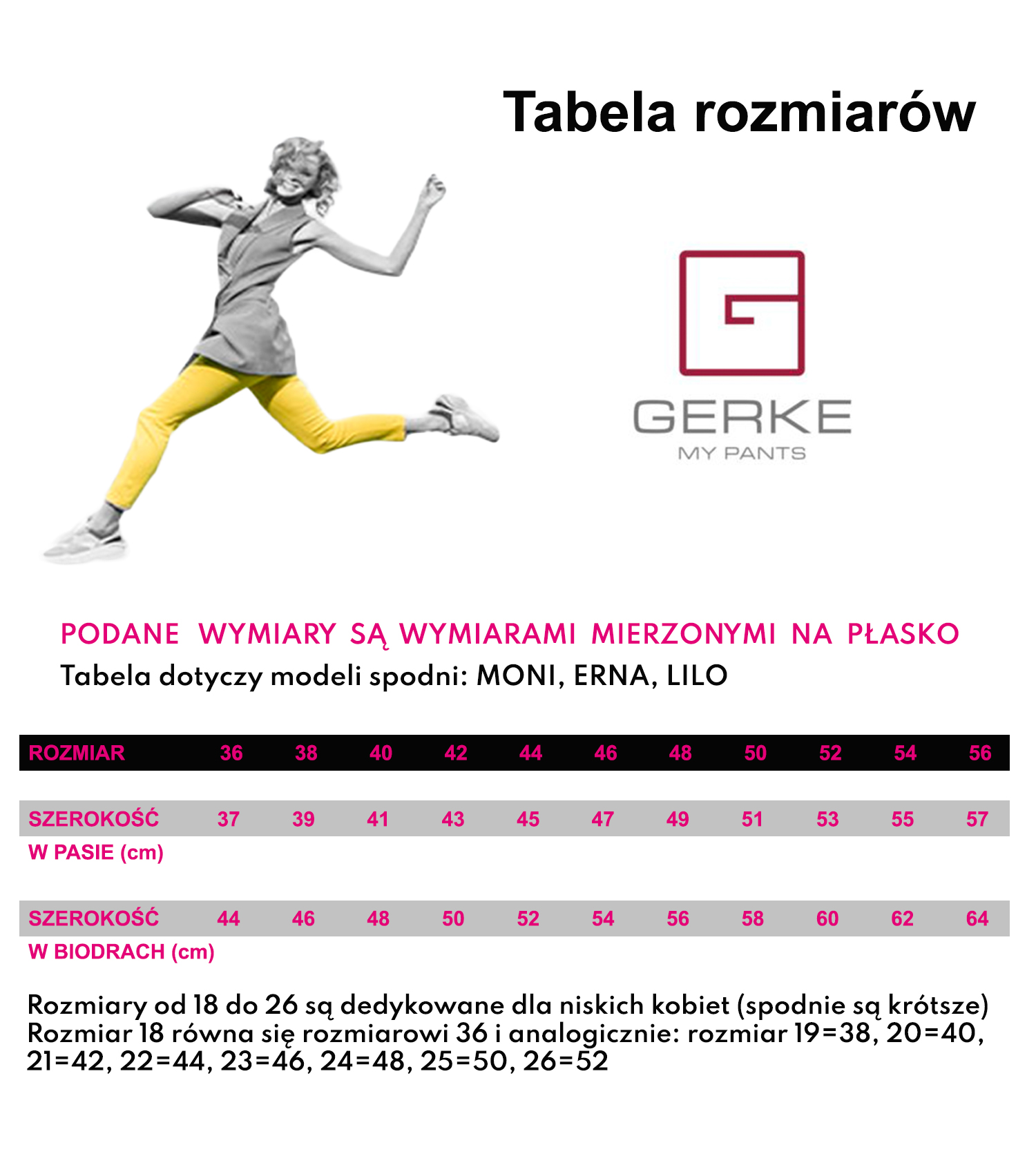Rozmiary od 18 do 26 są dedykowane dla niskich kobiet. Rozmiar 18 równa się rozmiarowi 36 i analogicznie rozmiar 19=38, 20=40, 21=42, 22=44, 23=46, 24=48, 25=50, 26=52 itd.