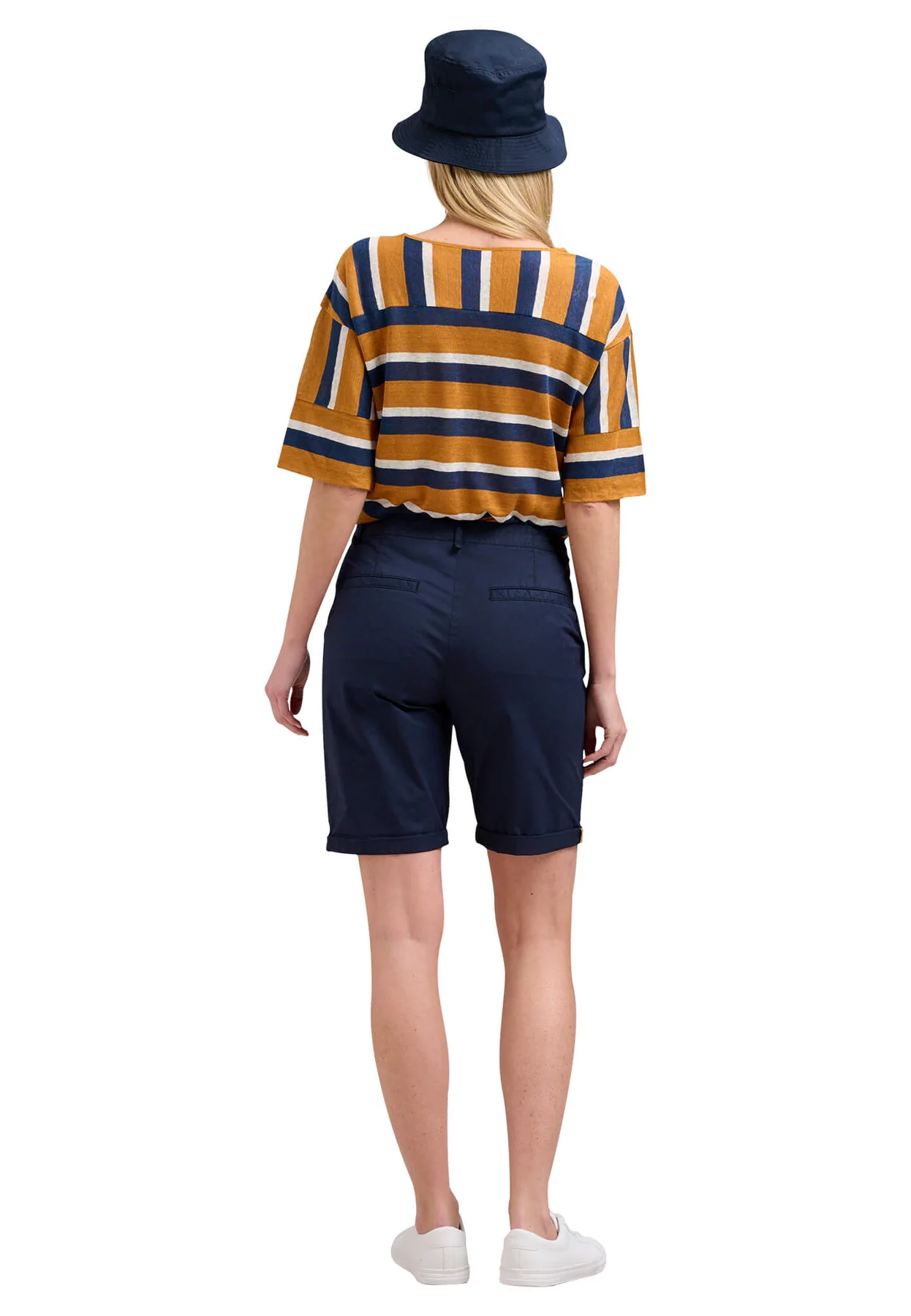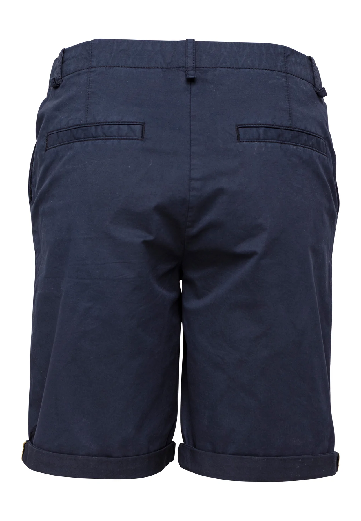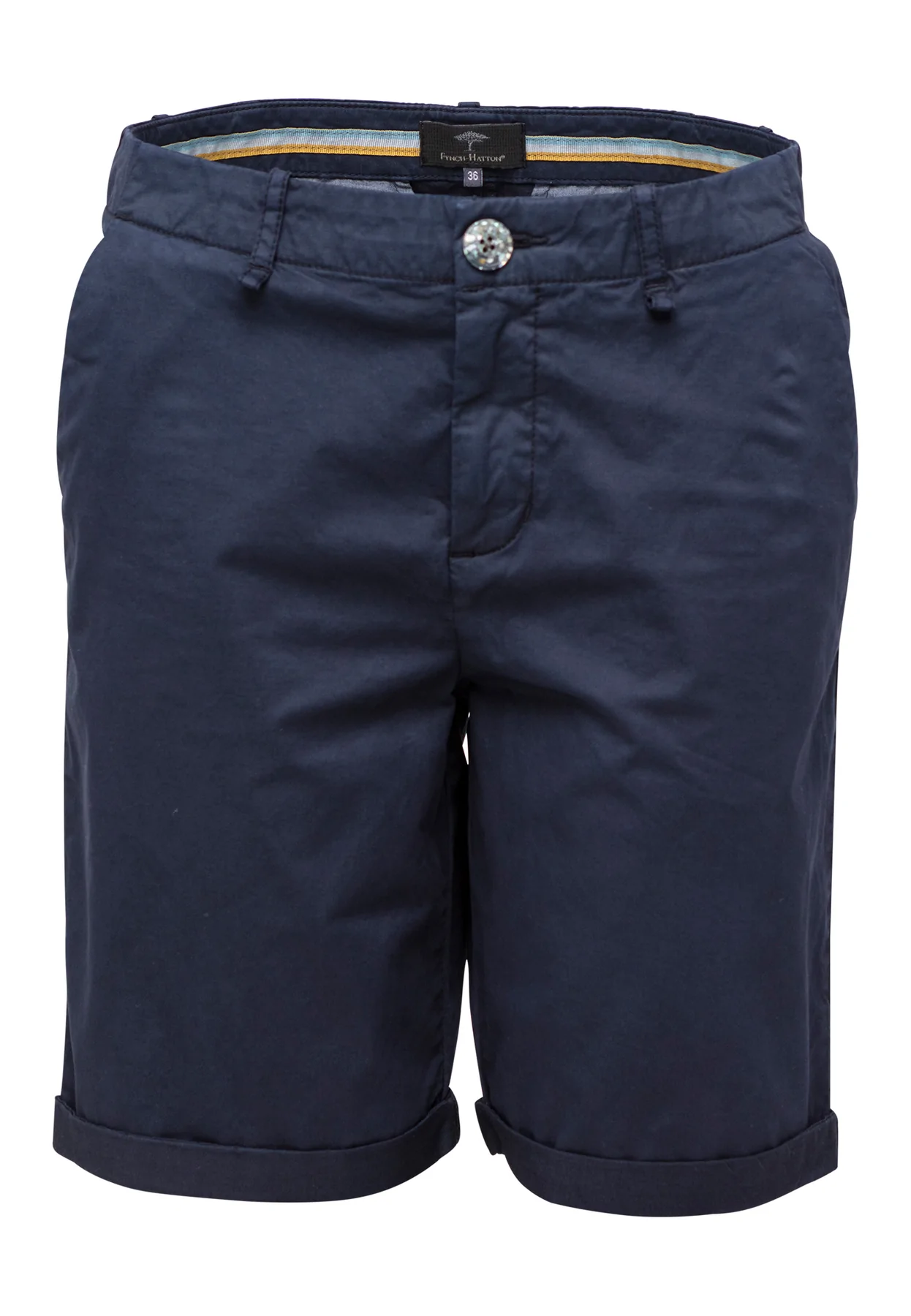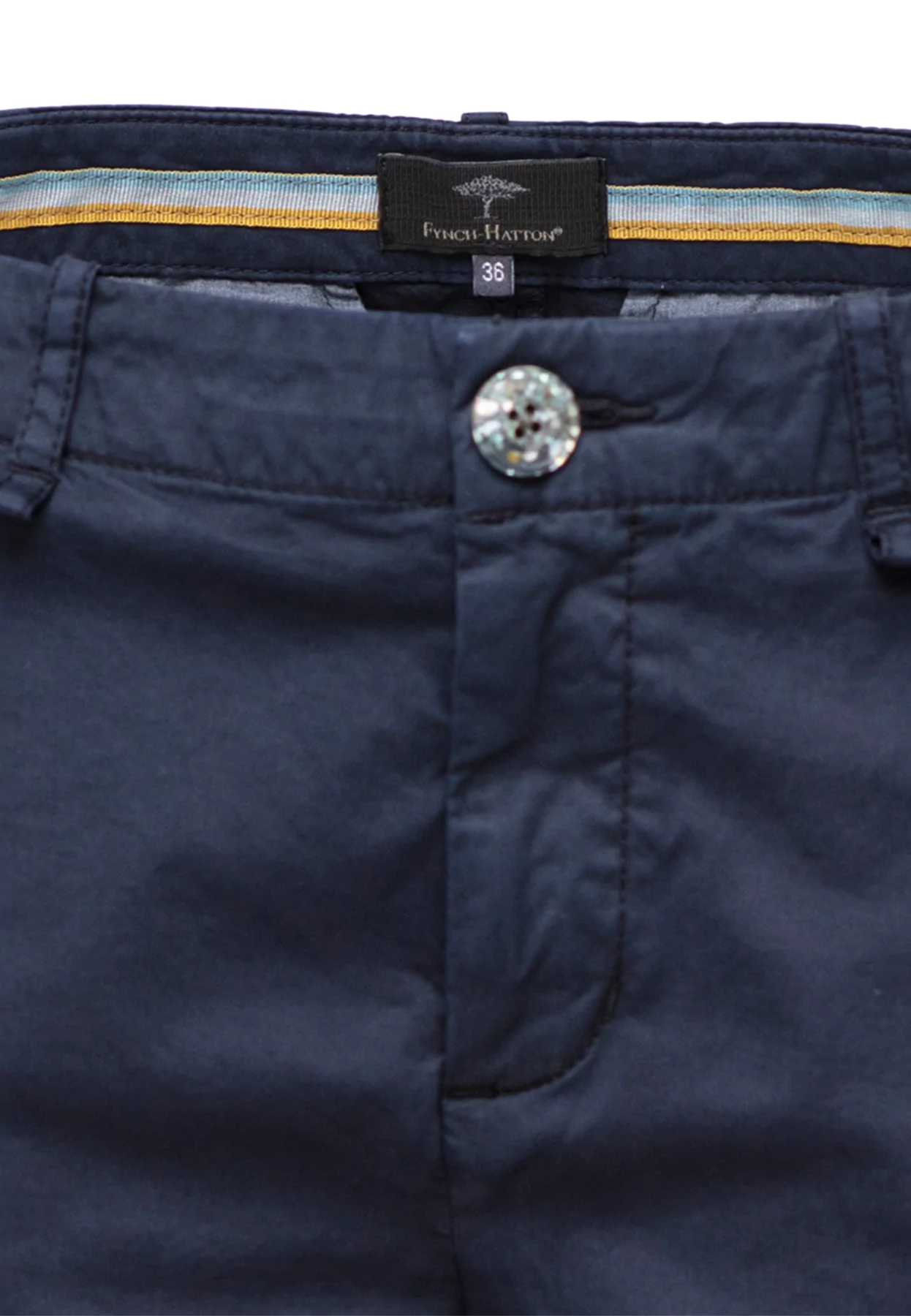 Bawełniane, elastyczne bermudy marki FYNCH-HATTON w kolorze granatowym. Wykonane z wysokiej jakości rozciągliwej bawełny spodenki mają lekko błyszcząca powierzchnię i funkcjonalne kieszenie. Ich odpowiednia długość nadaje się do wszelkich, wakacyjnych aktywności.
