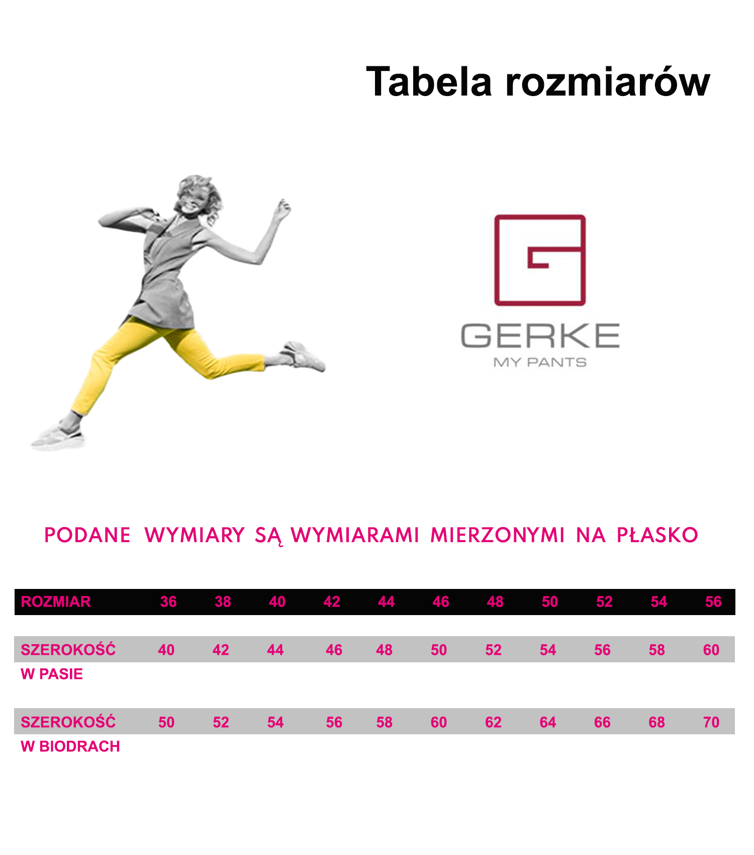 Gerke - marka spodni, która przypada do gustu wszystkim kobietom, które nie chcą iść na kompromis, jeśli chodzi o jakość, wykonanie i dopasowanie. Firma z ponad 80-letnim doświadczeniem w rzemiośle krawieckim. Niezależnie od stylu, czy jest elegancki, biznesowy, sportowy czy swobodny - Gerke fachowo łączy najwyższe oczekiwania dotyczące jakości i dopasowania ze starannie wyważonymi modnymi detalami.