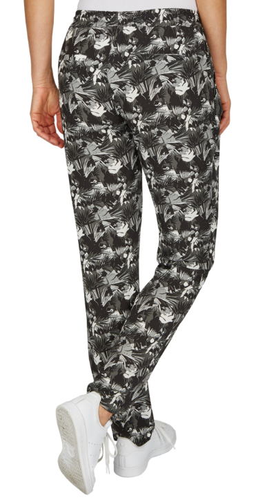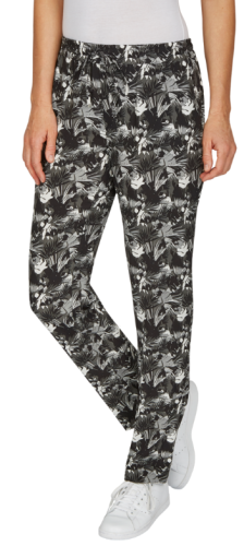 Spodnie LENE czarno-białe z wakacyjnym wzorem. Urocze, plażowe spodnie z miękkiej wiskozy. Modny nadruk, wspaniały krój i miękki materiał zapewniają niebywały komfort. Po prostu idealne spodnie na ciepłe, letnie dni.