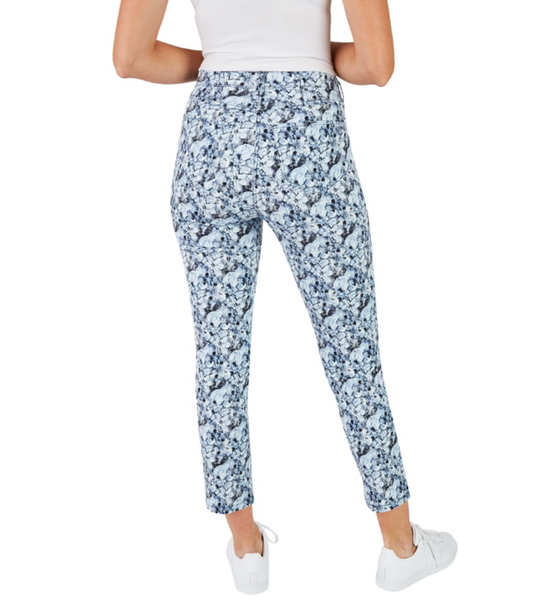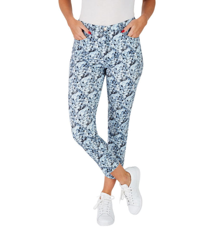 Spodnie MONI 3 w kolorze niebieskim z kwiatowym nadrukiem. Modne spodnie 7/8 o wygodnym kroju. Doskonałe dopasowanie oraz wysoka jakość wykonania zapewniają komfort i swobodę ruchu.