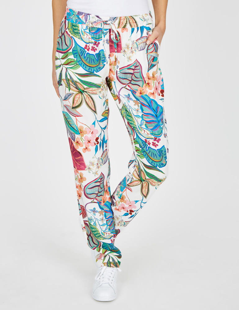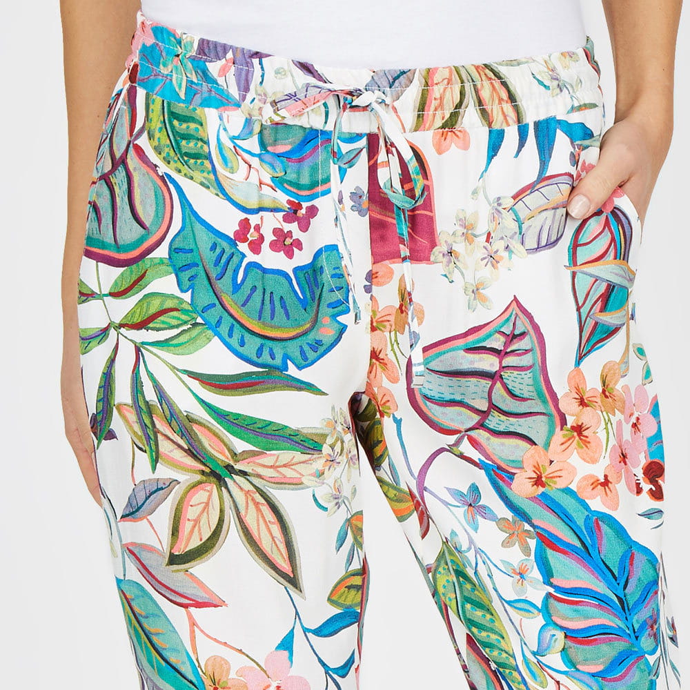 Spodnie LENE z kwiatowym wzorem. Urocze, plażowe spodnie z miękkiej wiskozy. Modny nadruk, wspaniały krój i miękki materiał zapewniają niebywały komfort. Po prostu idealne spodnie na ciepłe, letnie dni.