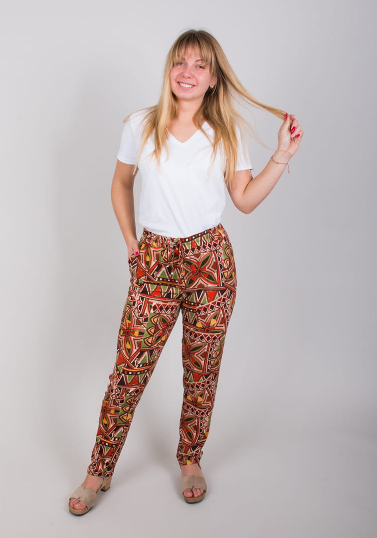 Spodnie LENE we wzory. Urocze, plażowe spodnie z miękkiej wiskozy. Modny nadruk, wspaniały krój i miękki materiał zapewniają niebywały komfort. Po prostu idealne spodnie na ciepłe, letnie dni.