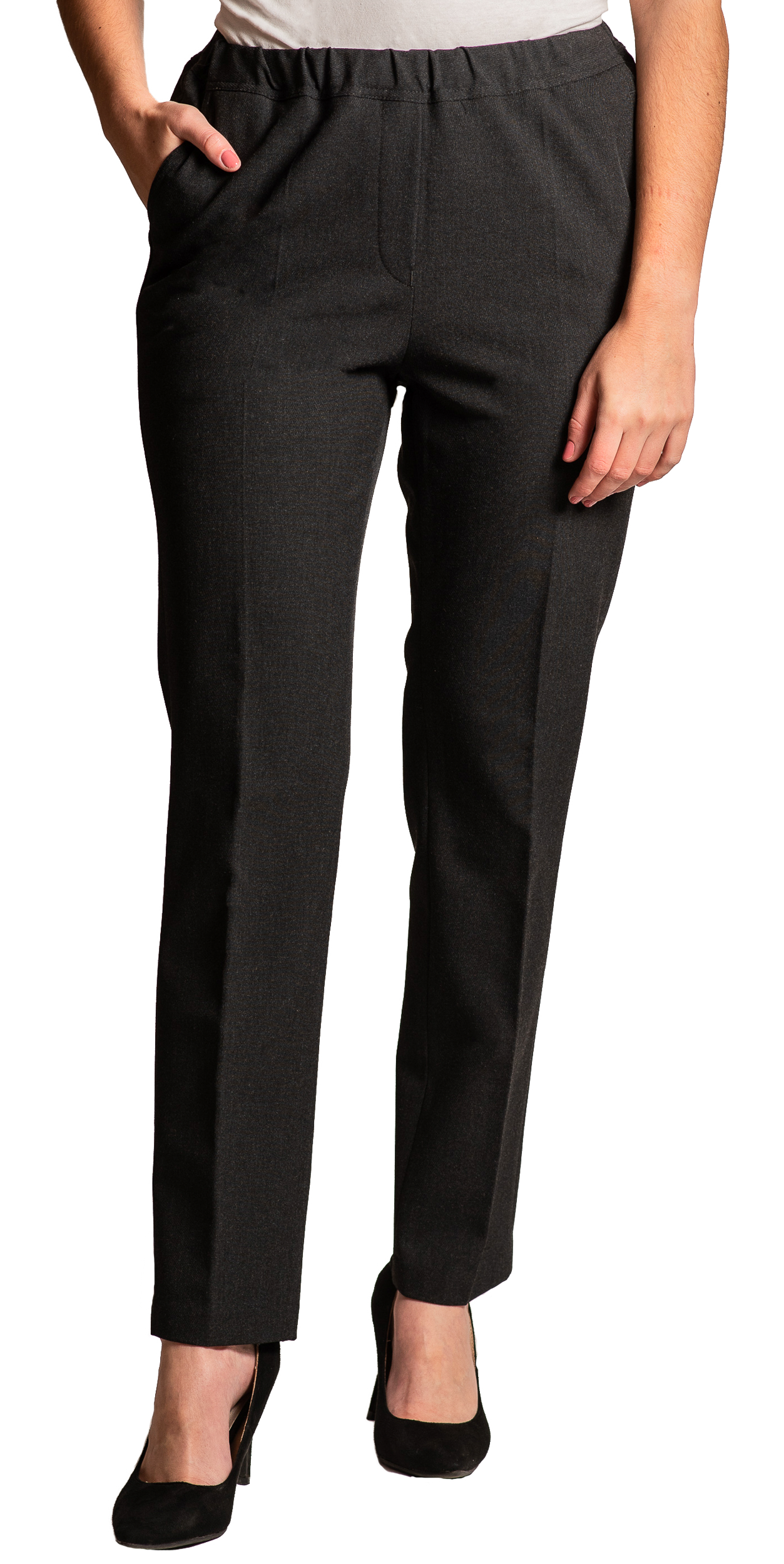 Spodnie MARION w kolorze ciemnoszarym. Stylowe a zarazem wygodne spodnie z wysokim stanem, wykonane z nieco grubszego materiału. Elegancki wygląd i dobre dopasowanie gwarantują wysoki komfort użytkowania.