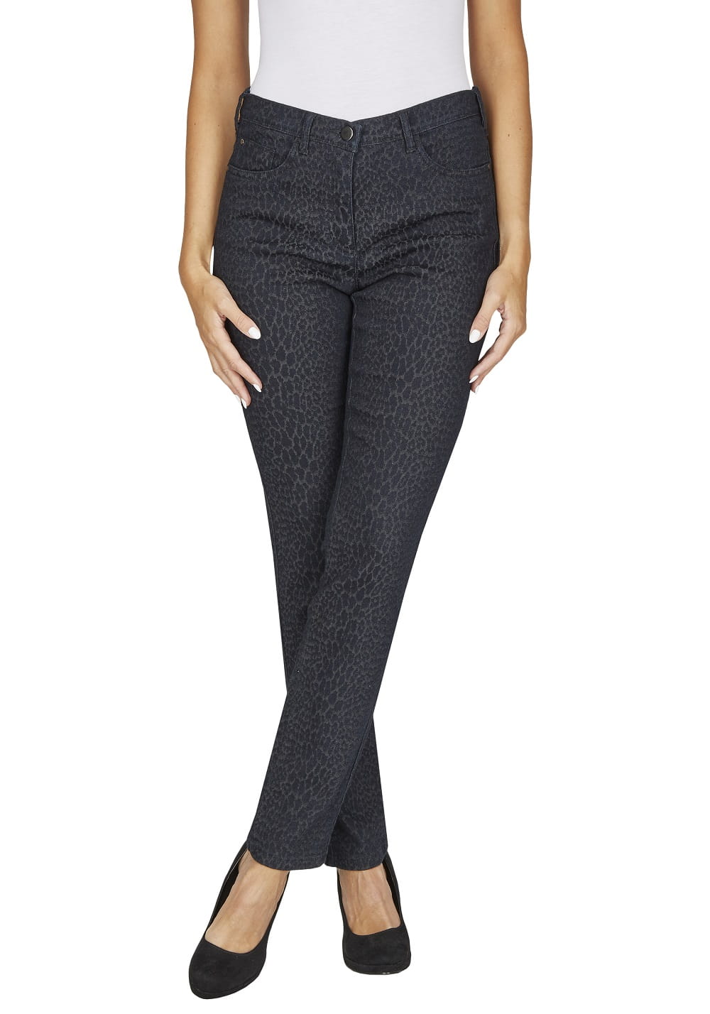 Spodnie MONI czarne w panterkę. Doskonałe dopasowanie oraz wysoka jakość wykonania zapewniają komfort i swobodę ruchu.