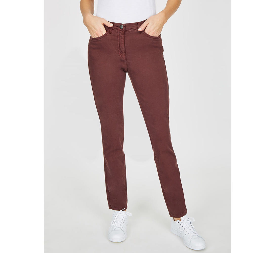 Spodnie MONI w kolorze czerwonego wina. Modne spodnie, elastyczny materiał i wygodny krój zapewniają niebywały komfort noszenia i swobodę ruchu. Spodnie idealnie się dopasowują poprzez bardzo elastyczną tylną część spodni, którą zapewnia ściągacz w tylnej części paska. Trwałość kolorów tkaniny gwarantuje długą żywotność i elegancki wygląd.