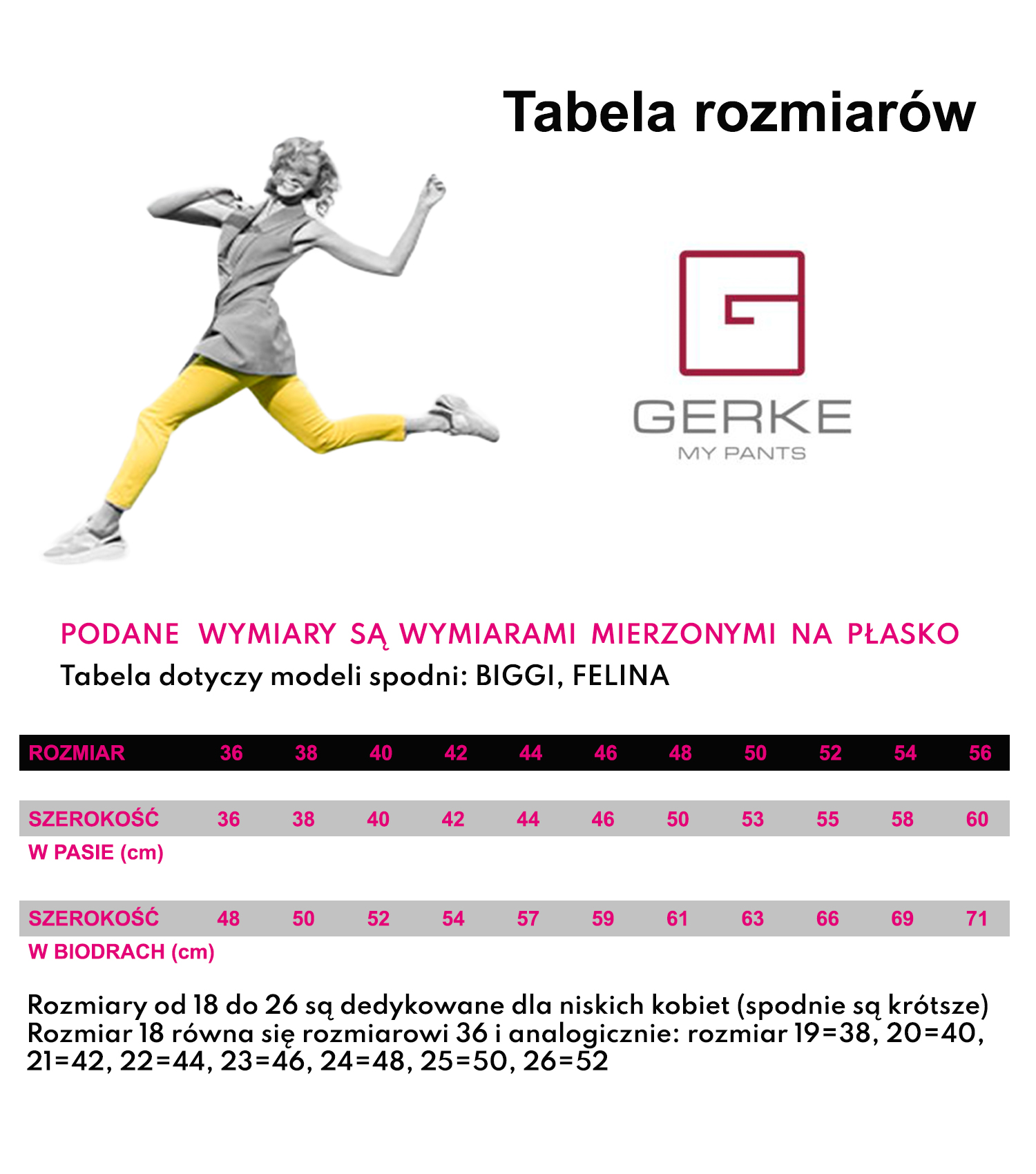Rozmiary od 18 do 26 są dedykowane dla niskich kobiet. Rozmiar 18 równa się rozmiarowi 36 i analogicznie rozmiar 19=38, 20=40, 21=42, 22=44, 23=46, 24=48, 25=50, 26=52
