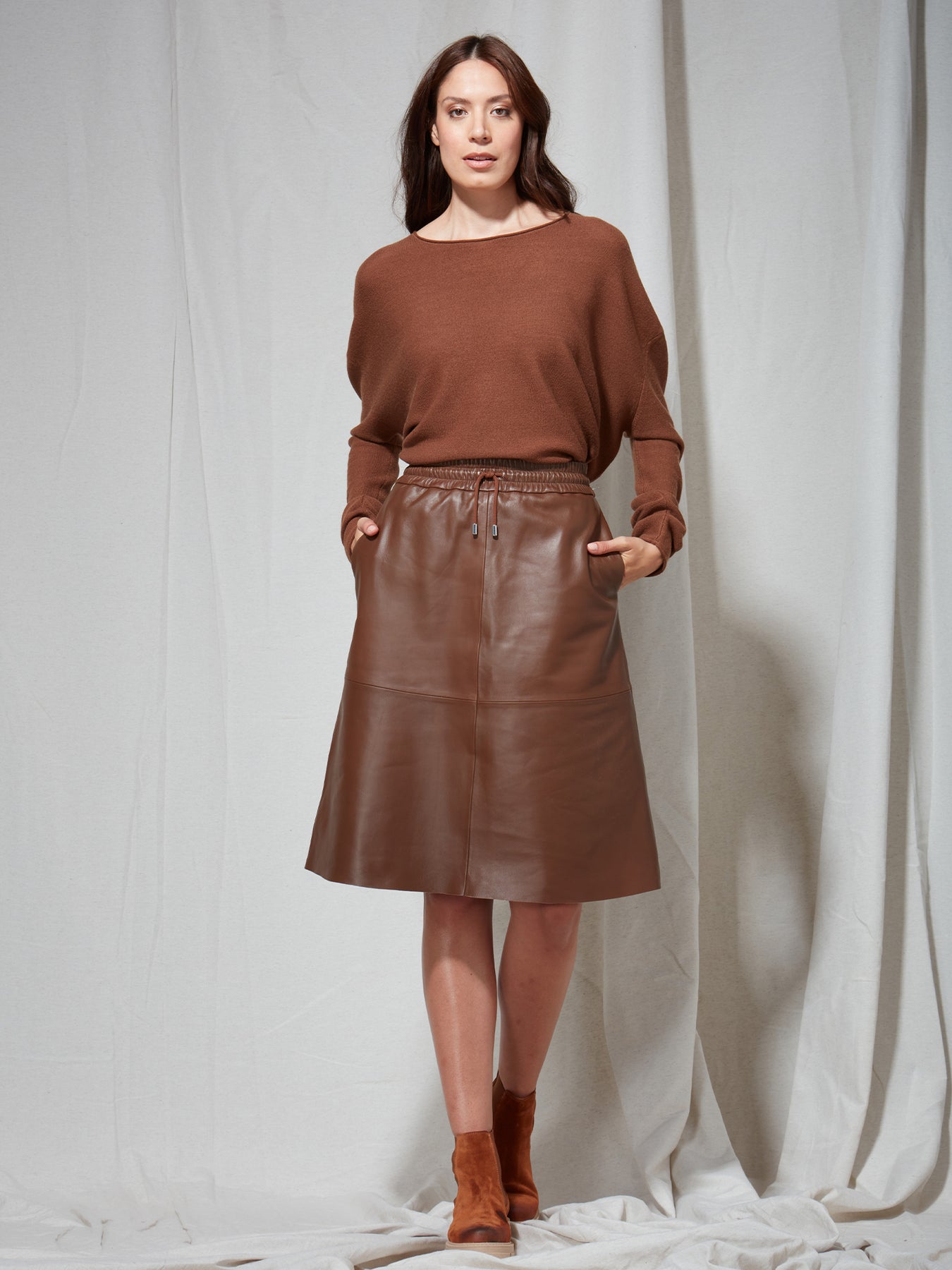 Spódnica firmy FYNCH-HATTON jest wykonana w 100% ze skóry w kolorze brązowym.