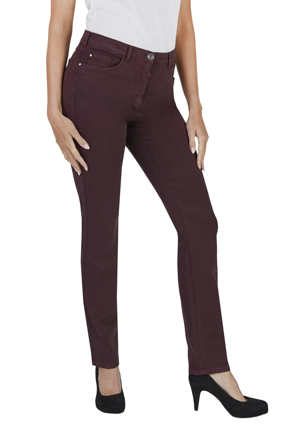 Spodnie MONI w kolorze bordowym. Modne spodnie, elastyczny materiał i wygodny krój zapewniają niebywały komfort noszenia i swobodę ruchu. Spodnie idealnie się dopasowują poprzez bardzo elastyczną tylną część spodni, którą zapewnia ściągacz w tylnej części paska. Trwałość kolorów tkaniny gwarantuje długą żywotność i elegancki wygląd.