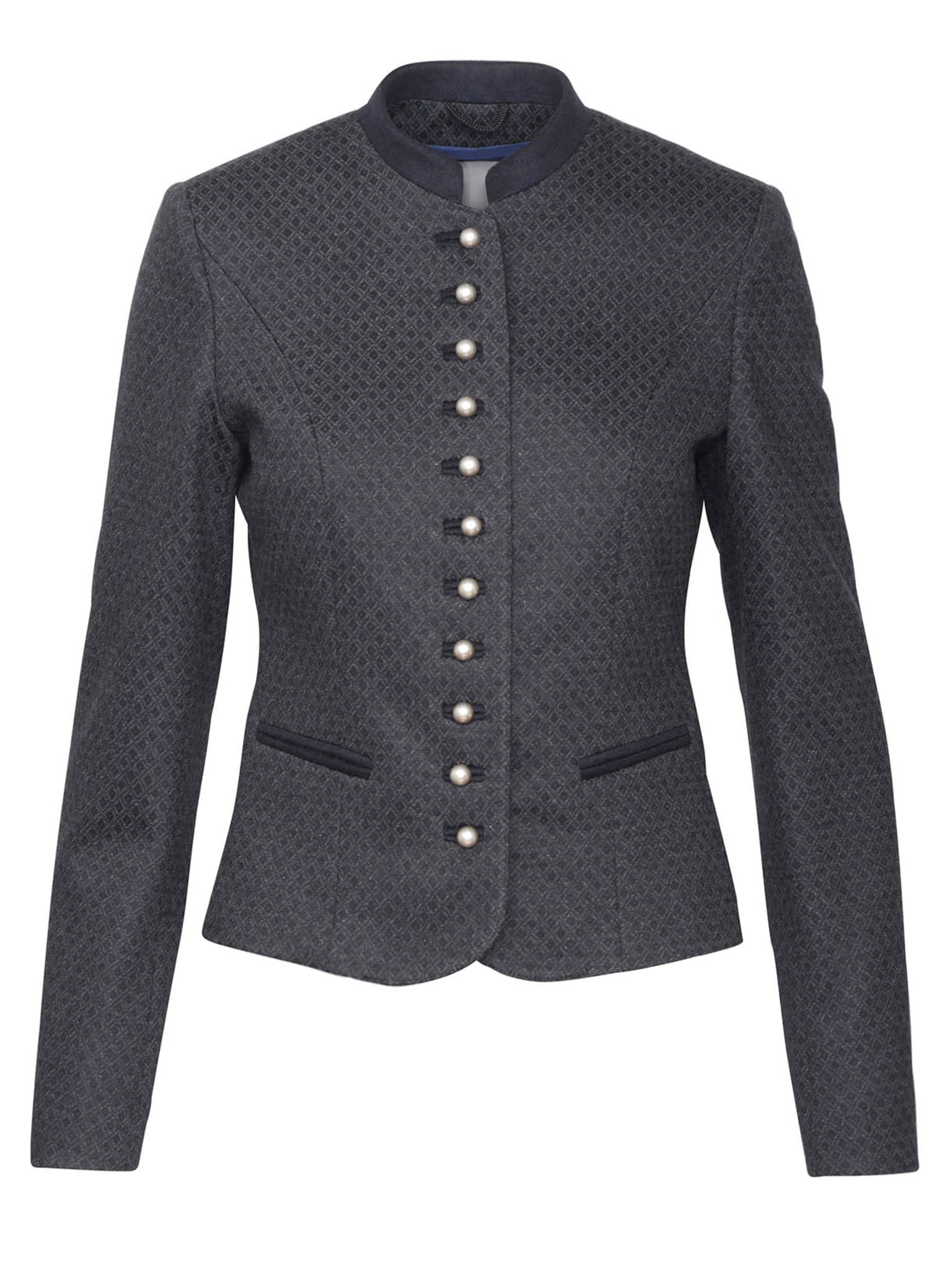 Elegancki żakiet ze stójką w kolorze granatowym.