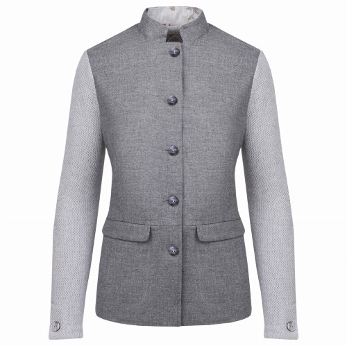 To wełniany, jednorzędowy damski żakiet w stylu bawarskim. Wykonany w 100% z wysokiej jakości wełny posiada ozdobne guziki, kołnierz ze stójką oraz dwie kieszenie z patkami.