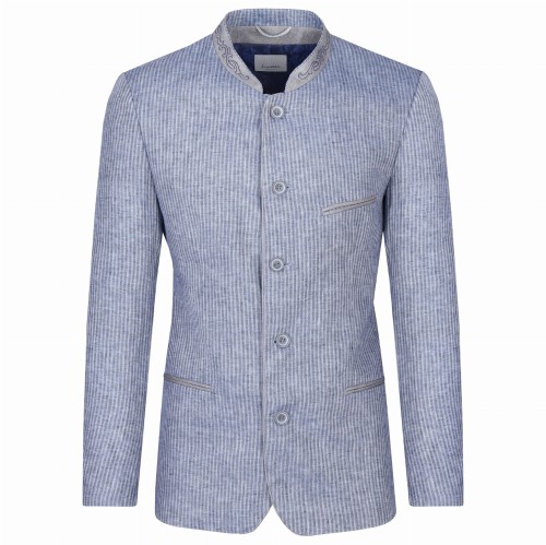 Oryginalna, austriacka marynarka z wzorem w delikatne paseczki, z pięknie zdobioną stójką. Ta lekka, lniana marynarka idealnie nadaje się na letnie spotkania, do pracy i na wieczorne wypady.