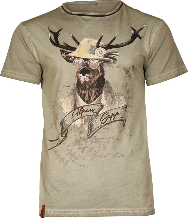 Bawełniany t-shirt męski w kolorze oliwkowym z nadrukiem jelenia w kapeluszu i okularach. Wykonany z najwyższej jakości czystej bawełny z okrągłym dekoltem.