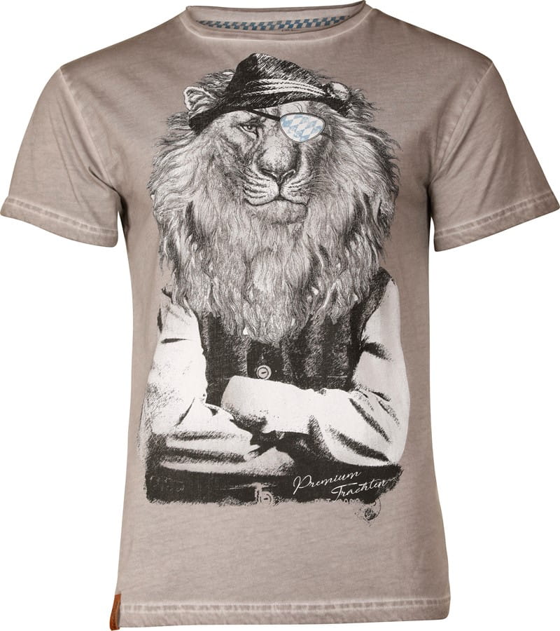 Bawełniany t-shirt męski w kolorze szarego melanżu z nadrukiem lwa w kapeluszu i przepaską na oku. Wykonany z najwyższej jakości czystej bawełny z okrągłym dekoltem.