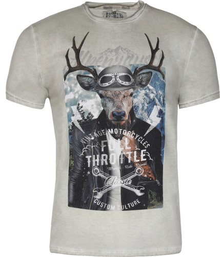 Bawełniany t-shirt męski w kolorze beżowym z nadrukiem jelenia w kasku. Wykonany z najwyższej jakości czystej bawełny z okrągłym dekoltem.