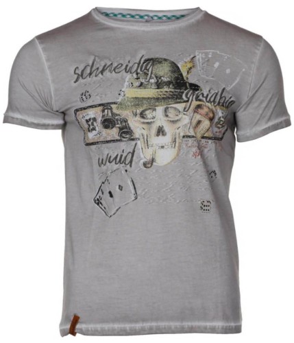 Bawełniany t-shirt męski w kolorze szarym z nadrukiem czaszki z fajką w bawarskim kapeluszu. Wykonany z najwyższej jakości czystej bawełny z okrągłym dekoltem.