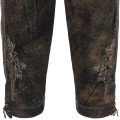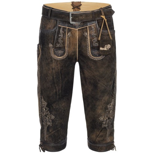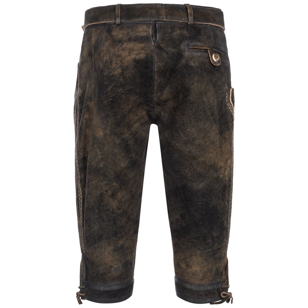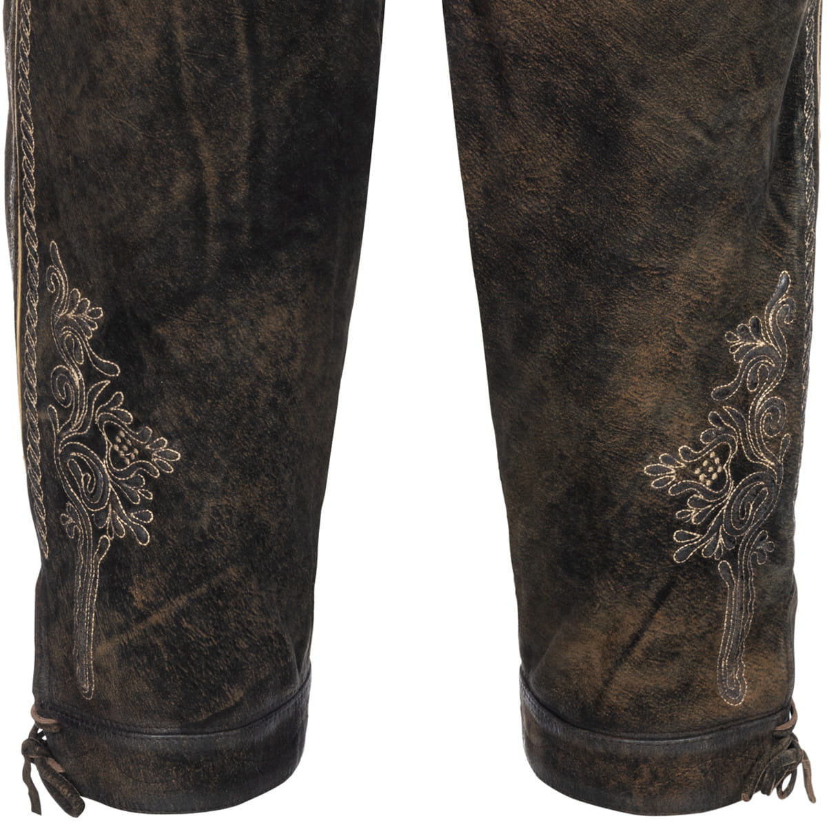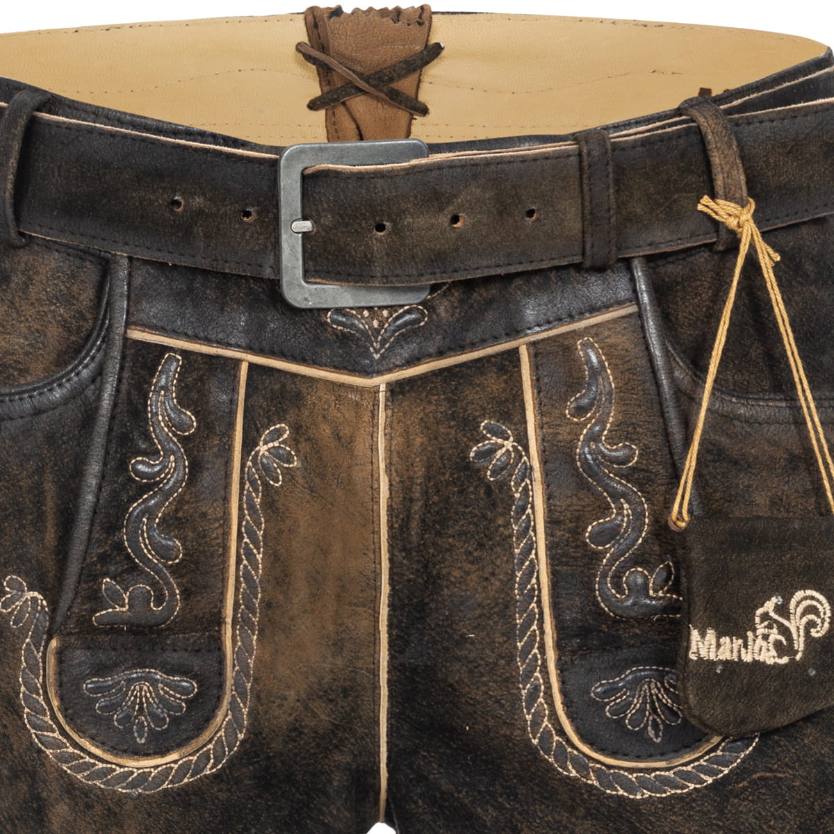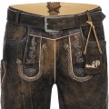 Spodnie skórzane SCHORSCHI z paskiem w typowym austriackim fasonie. Specjalna obróbka nadaje spodniom wygląd zniszczonej skóry, a beżowe hafty oryginalnego stylu. Doskonałej jakości skóra zapewnia lekkość i wspaniałe właściwości użytkowe. Model ten zdobią guziki wykonane z poroża jelenia na pasie.